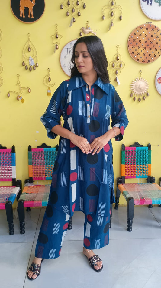 "Anika" Blue cotton mirror work kurti pant set with natural cotton dupatta