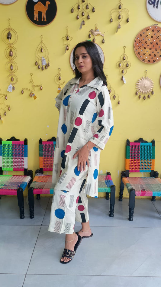 "Anika" White cotton mirror work kurti pant set with natural cotton dupatta