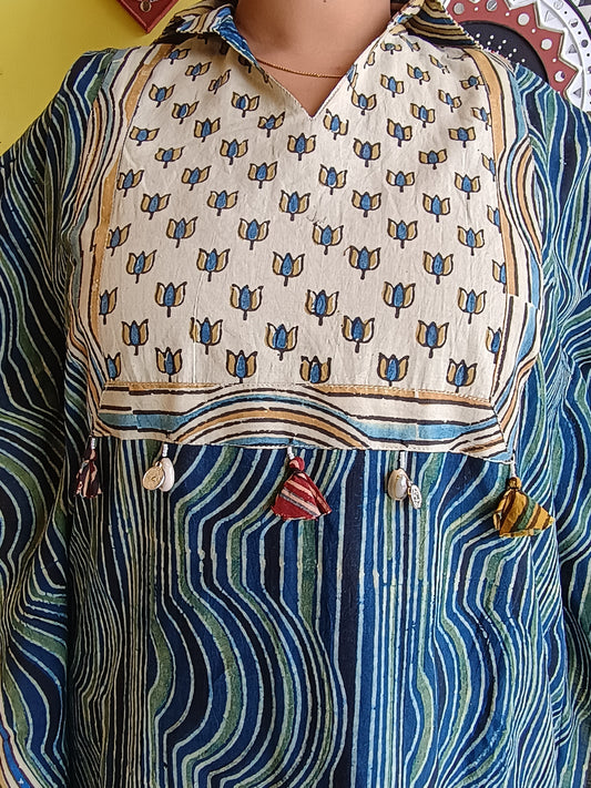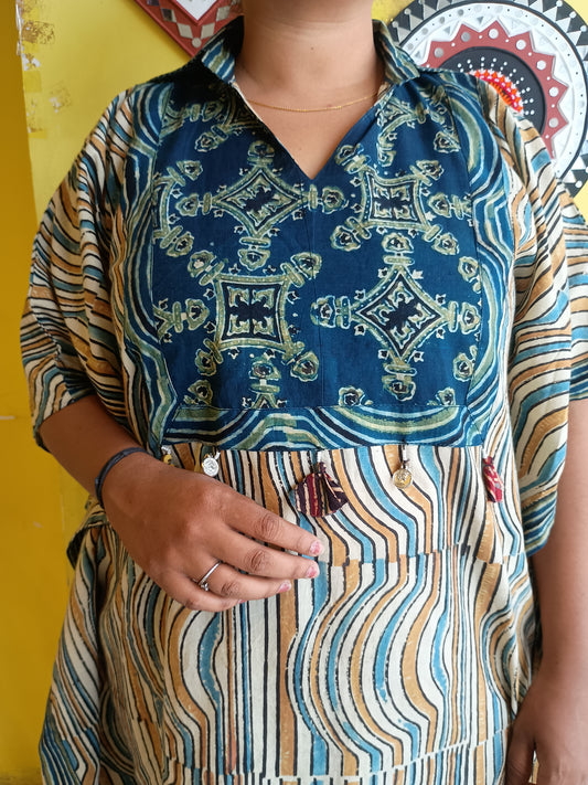 *Arushi* natural handblock cotton frock style kurti with hand work patch