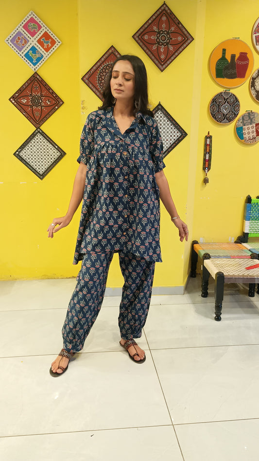 "Ankita" Natural handblock cotton blue kaftan style co-ord set