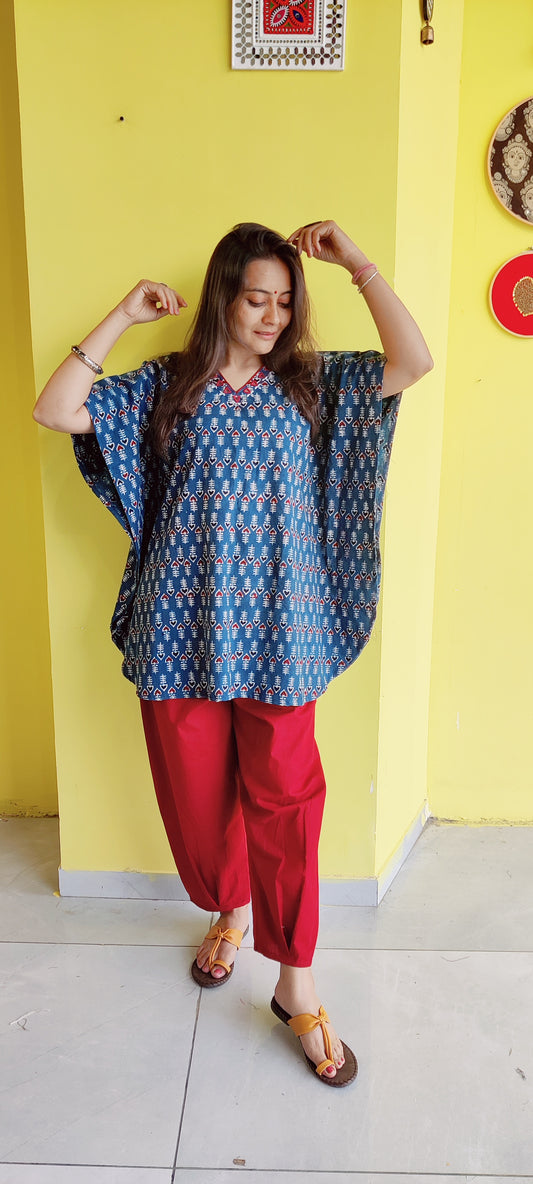 "Ankita" Natural handblock cotton blue kaftan style co-ord set