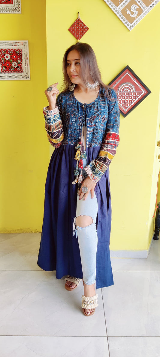 "Ishani"Blue natural cotton long mirror work jacket