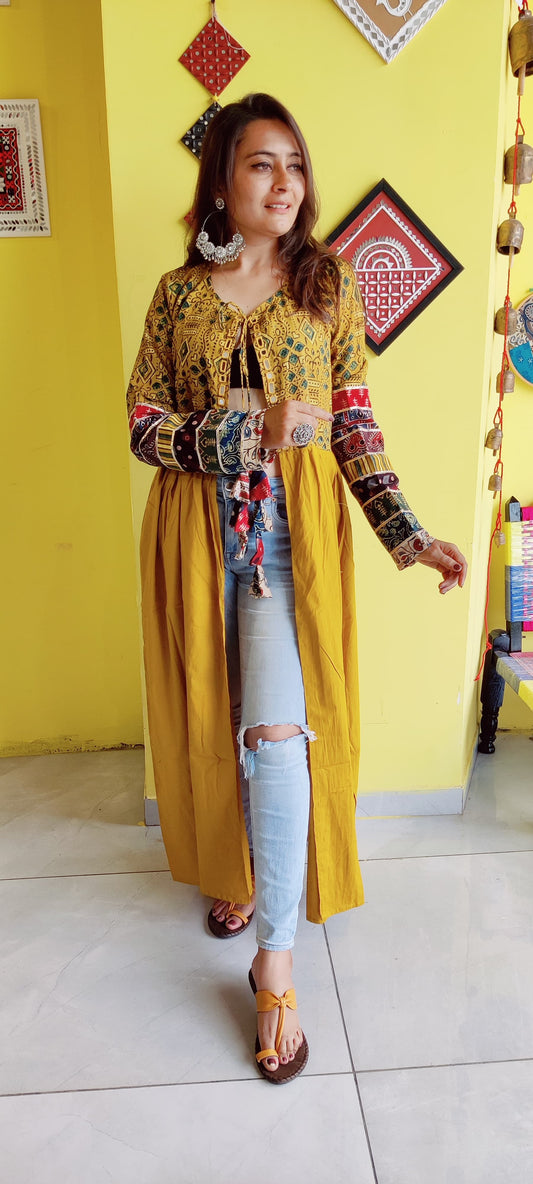 "Ishani" Yellow cotton mirror work long jacket