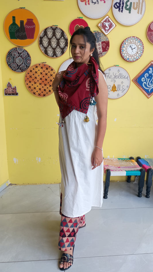 "Anika" White cotton mirror work kurti pant set with natural cotton dupatta