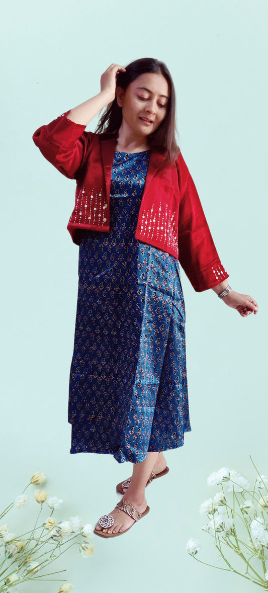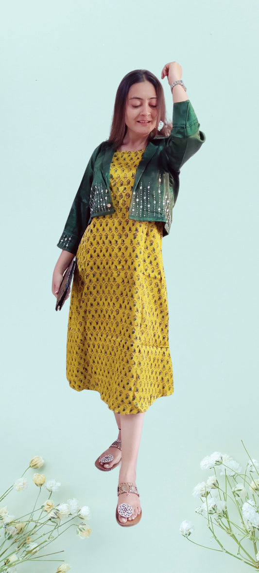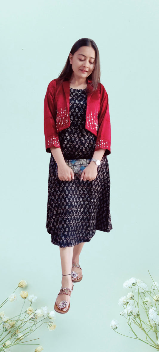 "NITYA" Mashroo printed kurti with mirror work jacket