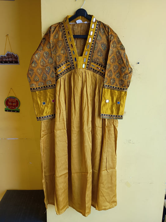 "Alia" yellow Mashroo with modal mirror work alia cut kurti
