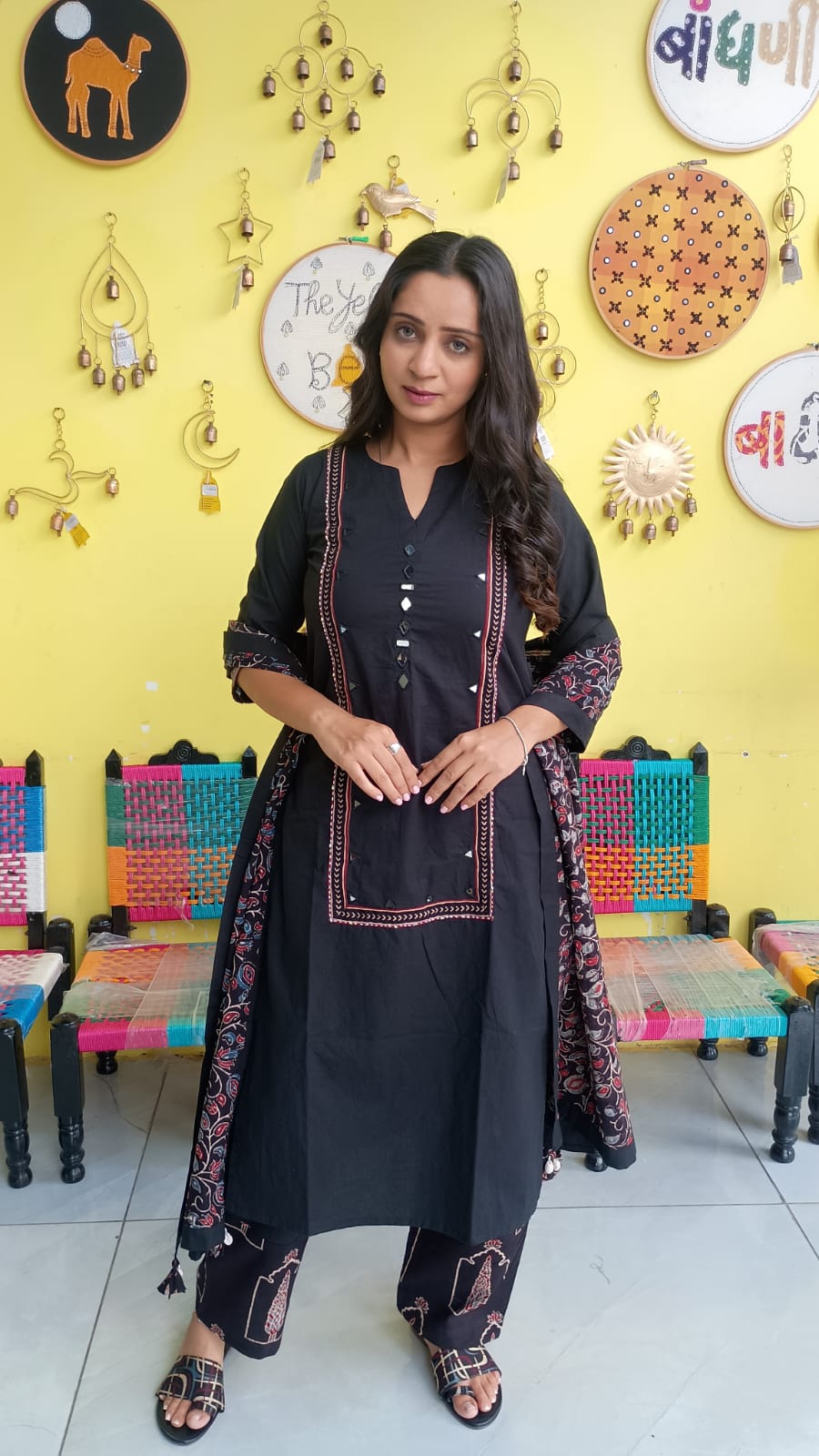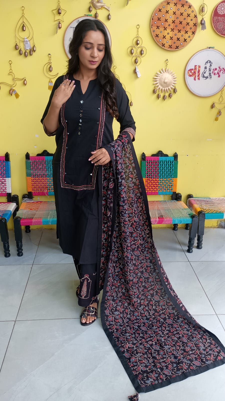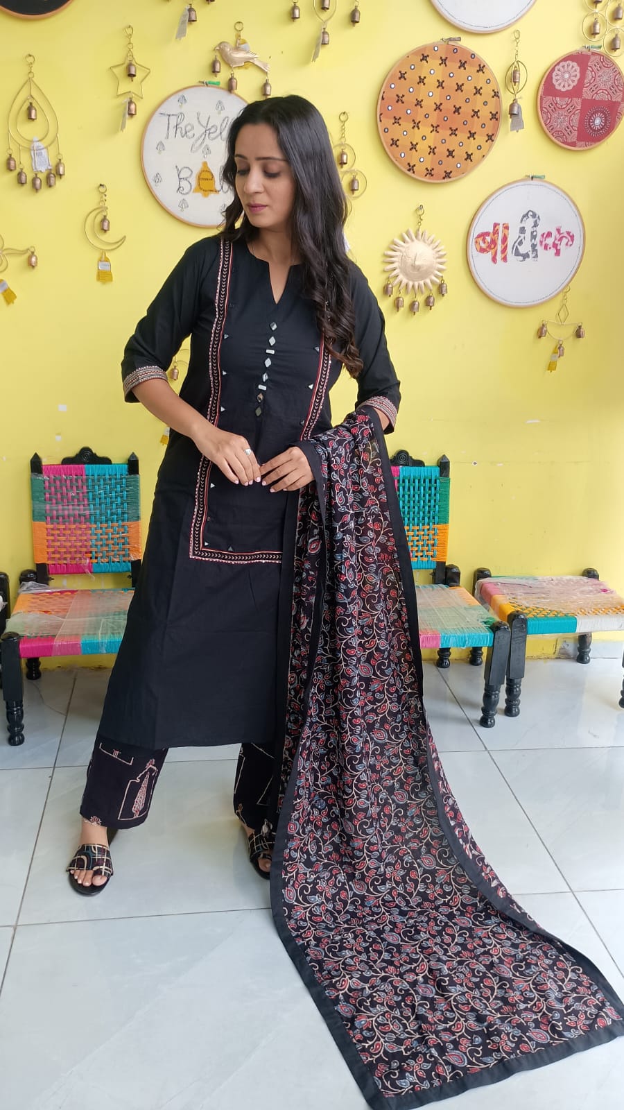 "Anika" Black cotton mirror work kurti pant set with natural cotton dupatta