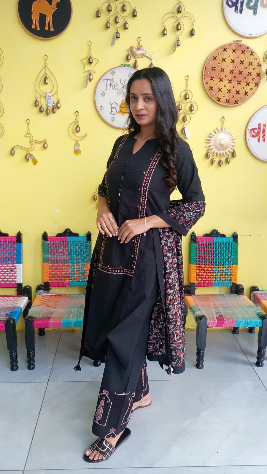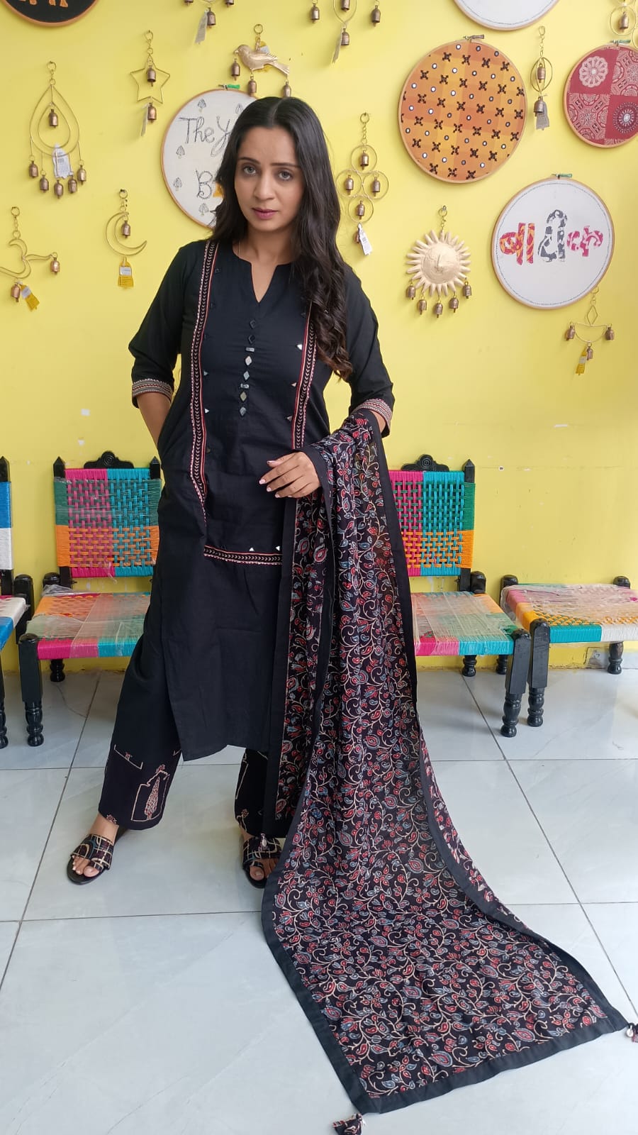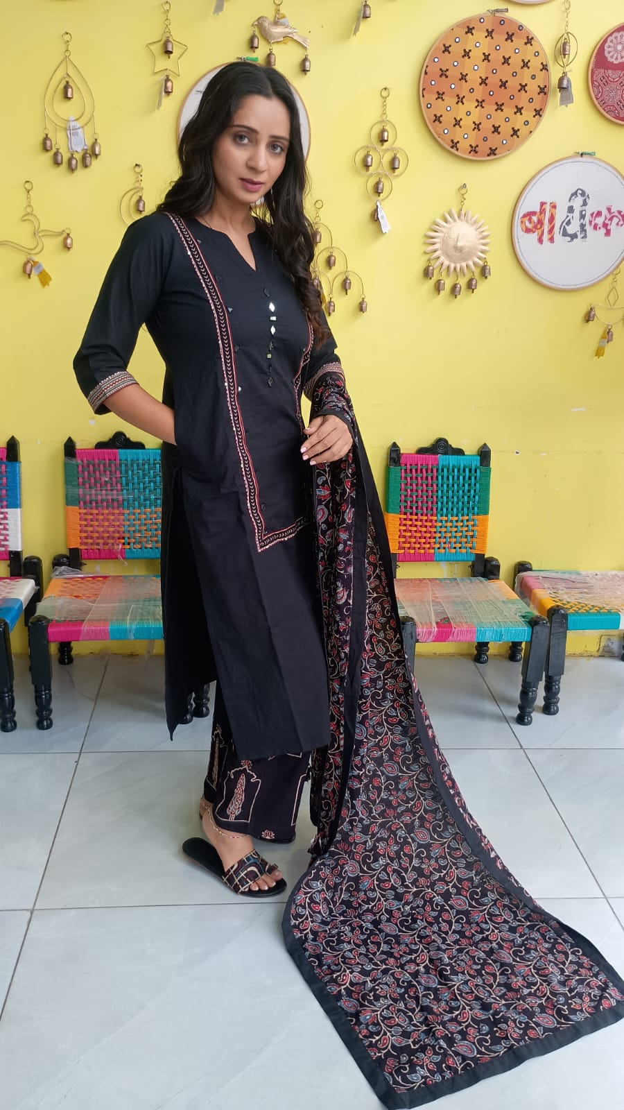 "Anika" Black cotton mirror work kurti pant set with natural cotton dupatta