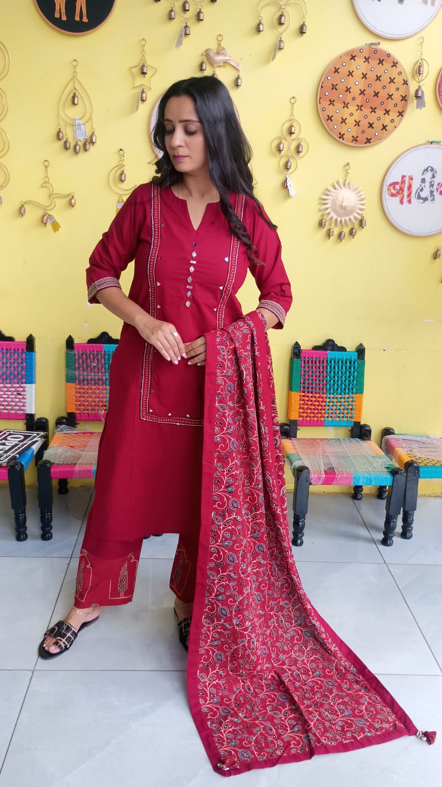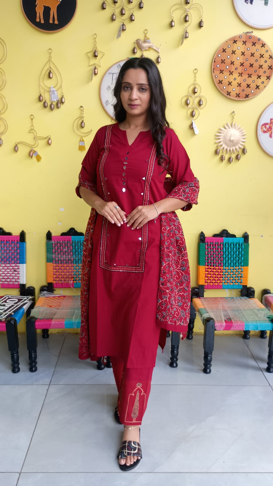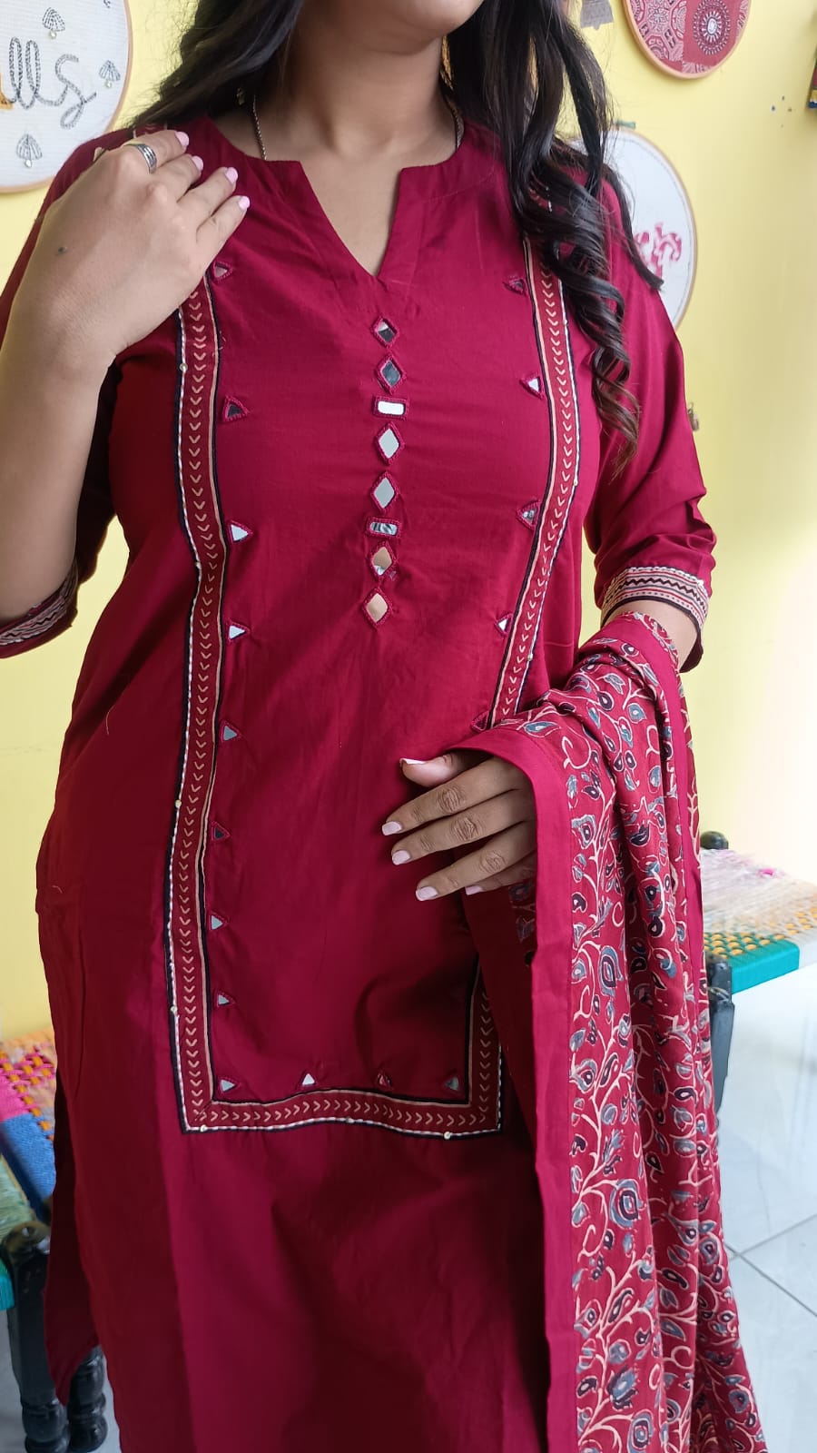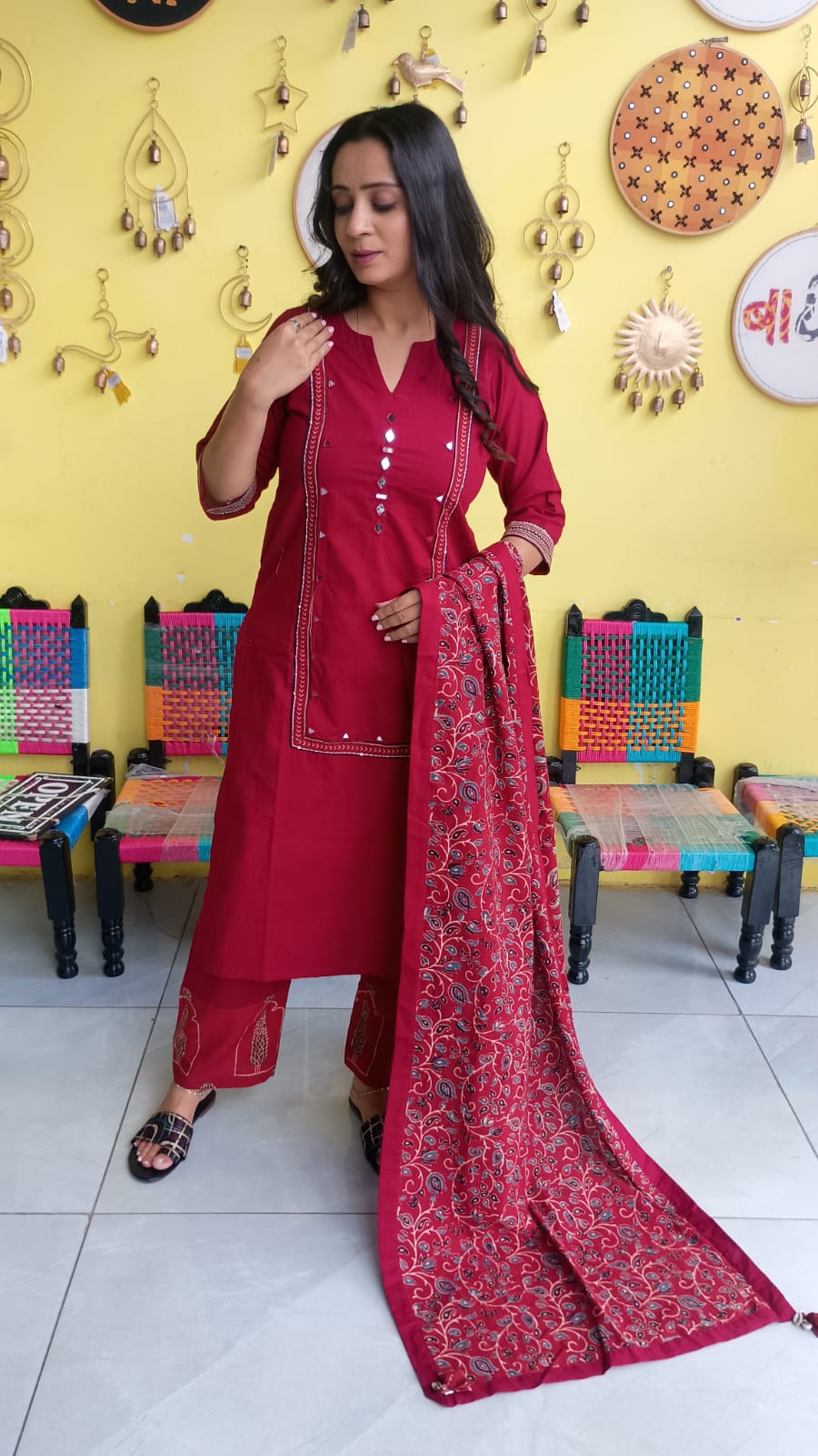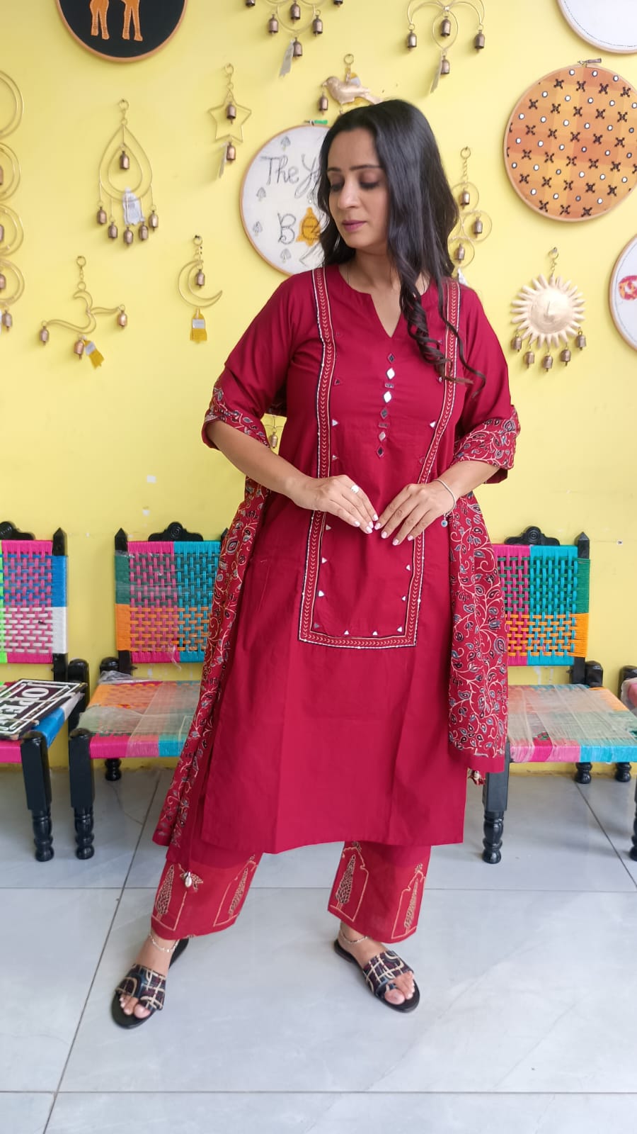 "Anika"Plain cotton mirror work kurti pant set with natural cotton dupatta