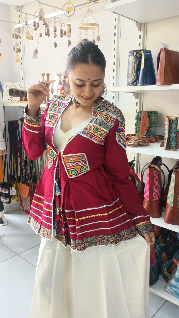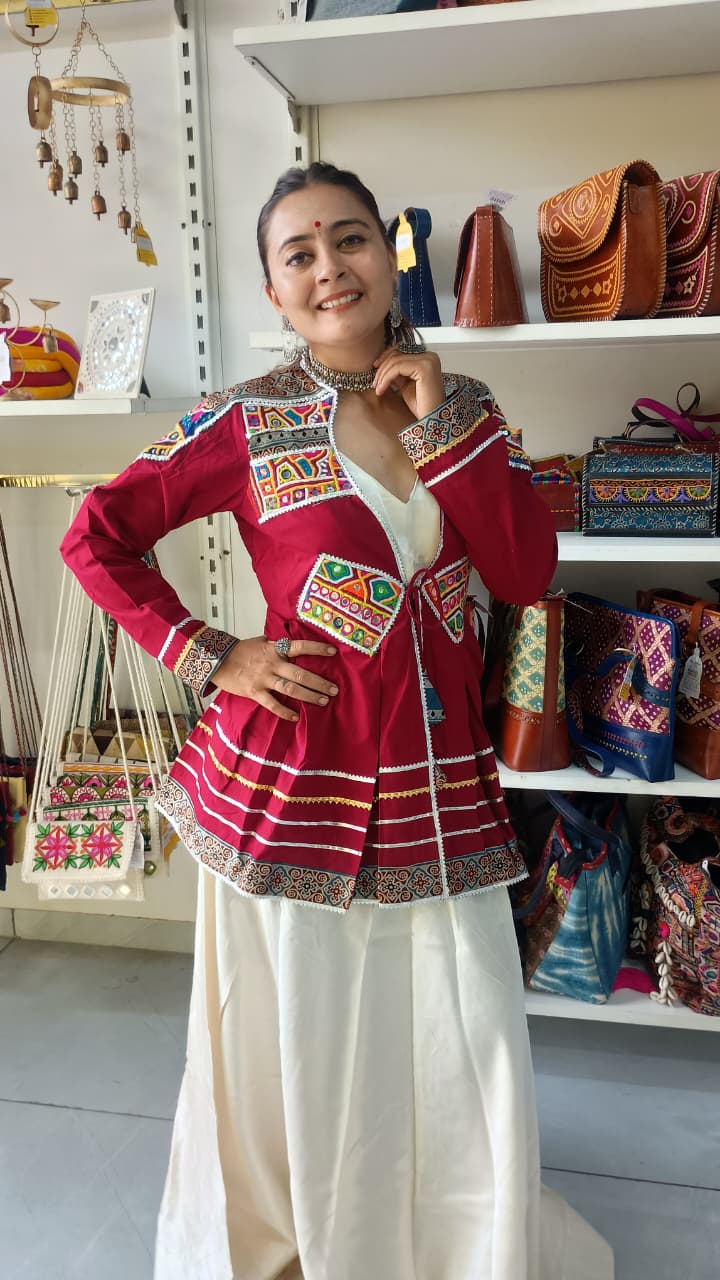 This Maroon plain cotton Navratri special kedia is adorned with colorful handwork patches, showcasing intricate embroidery and traditional artistry. Lightweight and breathable, it ensures comfort while adding festive elegance, making it an ideal choice for Garba nights and cultural celebrations.