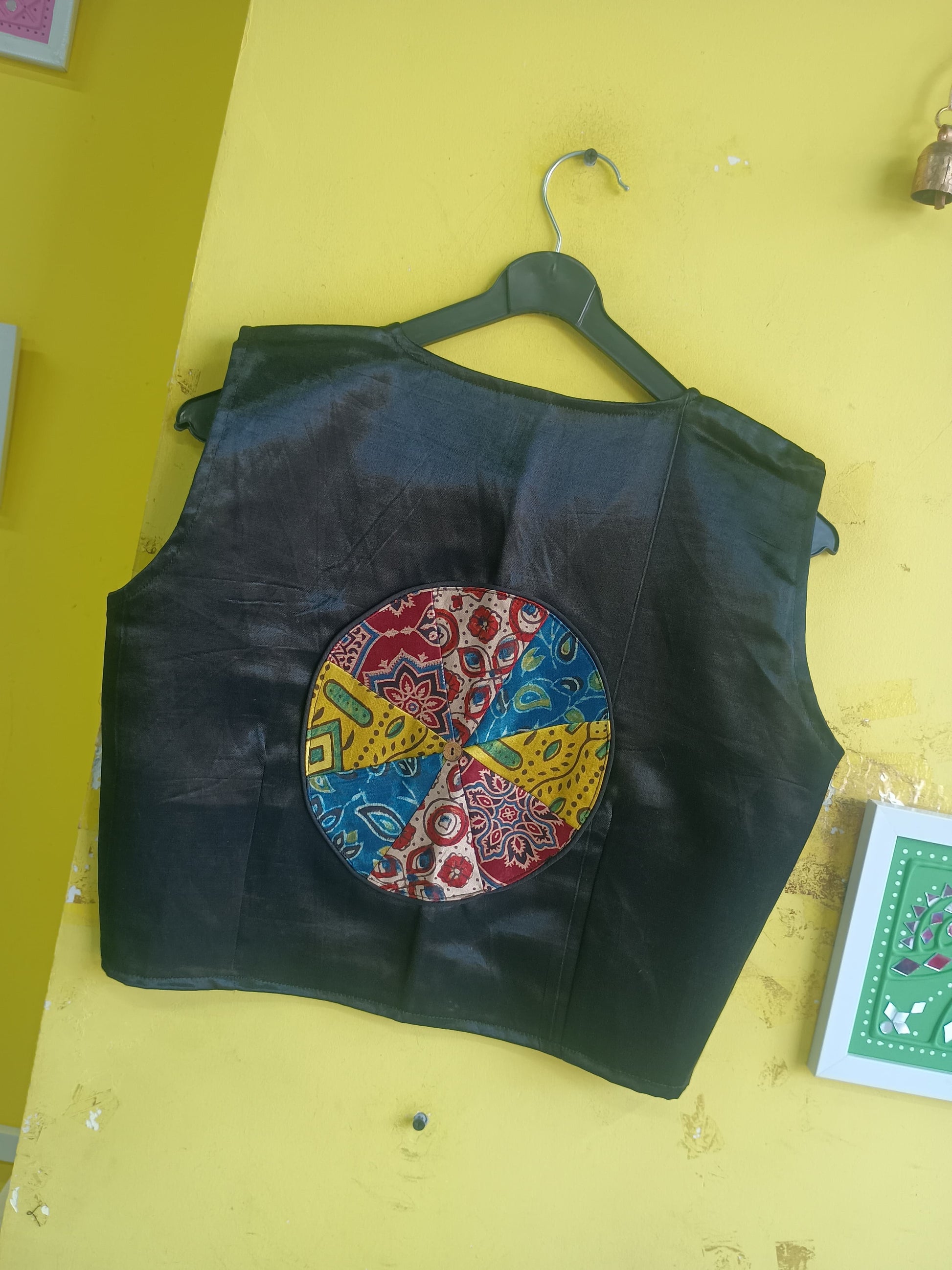 Elegant sleeveless blouse in rich maroon features a flattering V-neck, front wooden buttons, and a striking hand-painted circular motif at the back. Crafted in soft fabric, it pairs beautifully with skirts or lehengas for festive, ethnic occasions and modern styling.