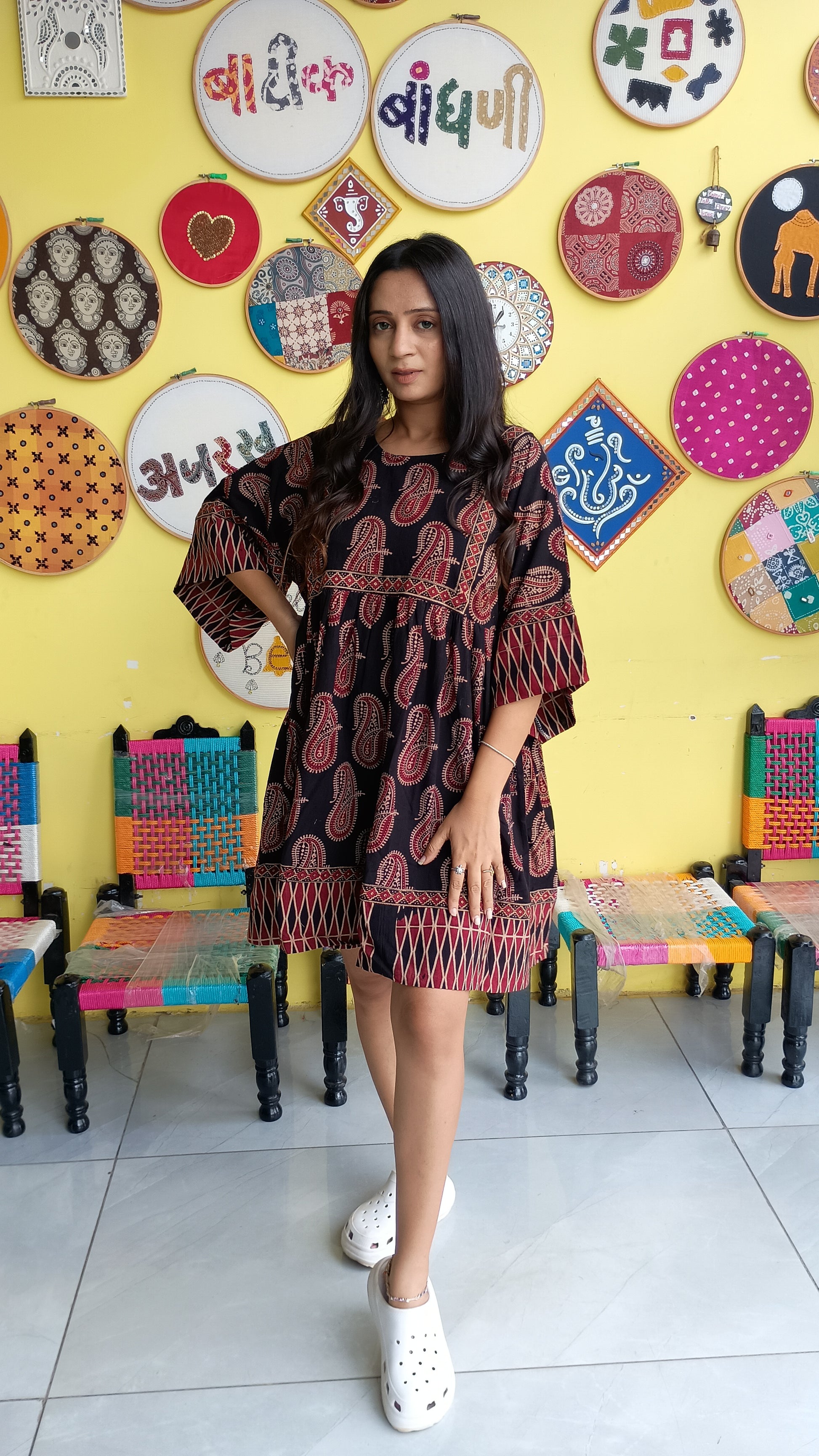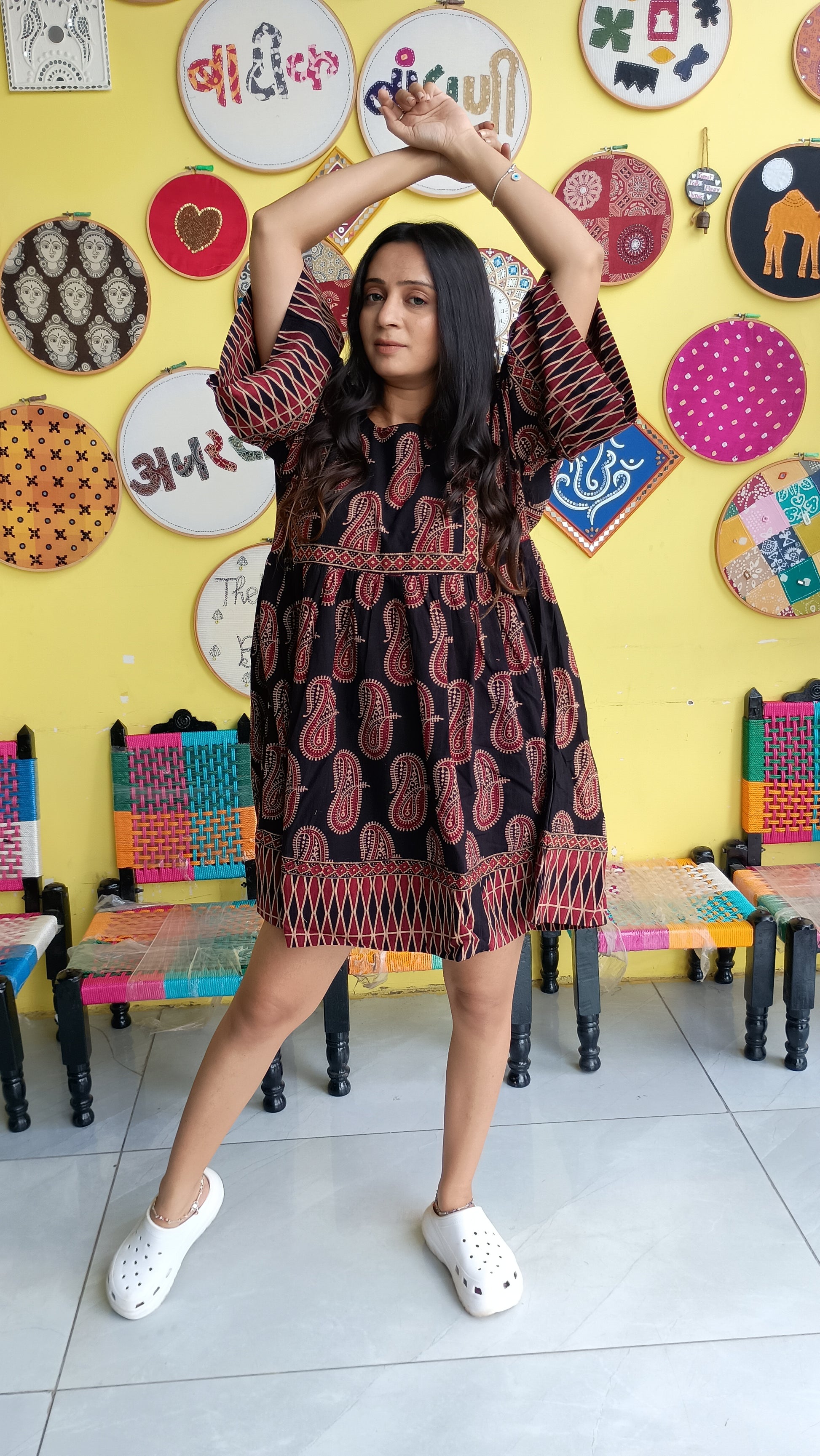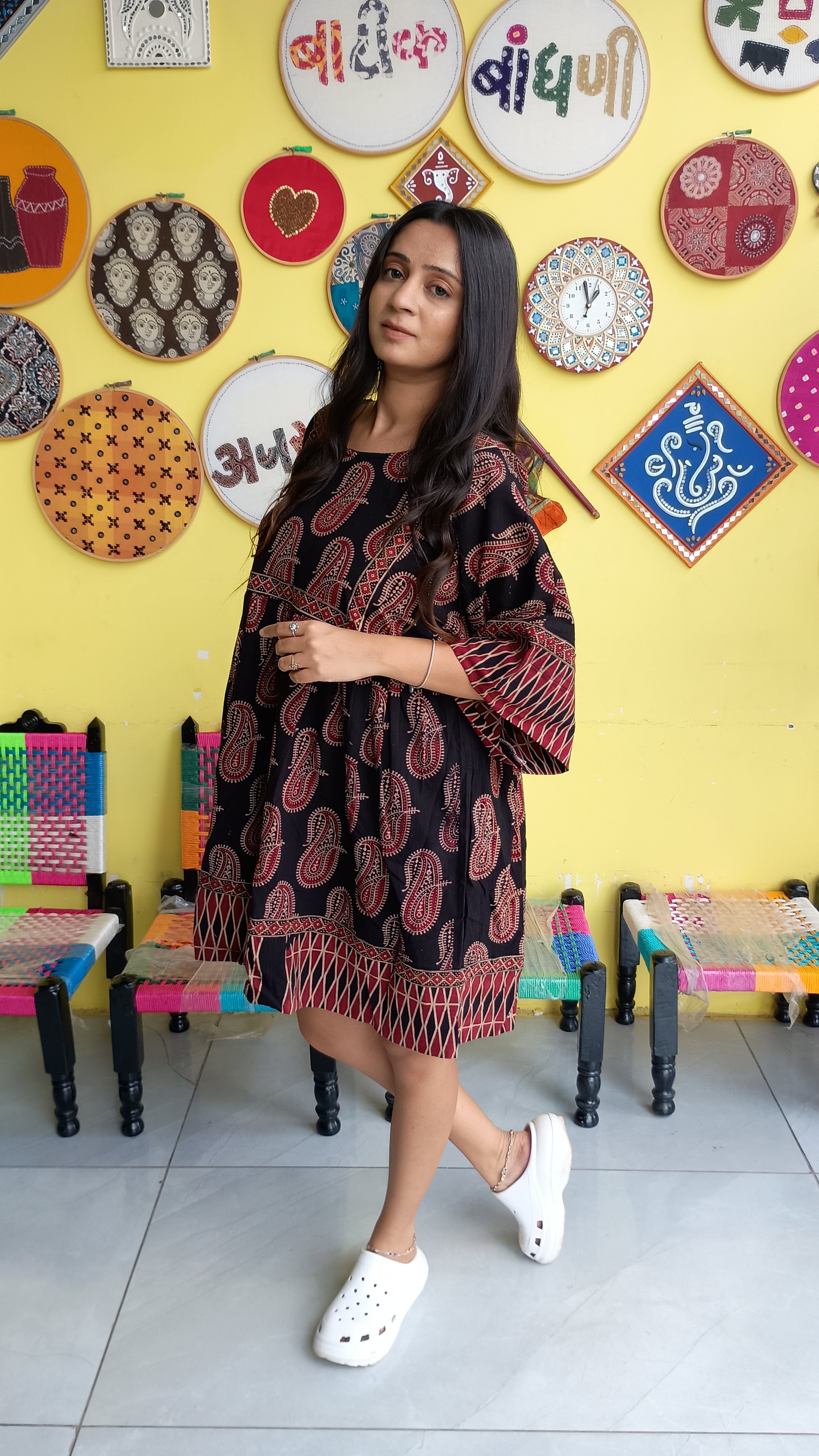 This Ajrakh handblock cotton knee-length one-piece features traditional prints, a comfortable fit, and a stylish one-side pocket. Designed with elegant bell sleeves, it's perfect for casual outings or ethnic-inspired looks, offering both charm and breathable all-day comfort