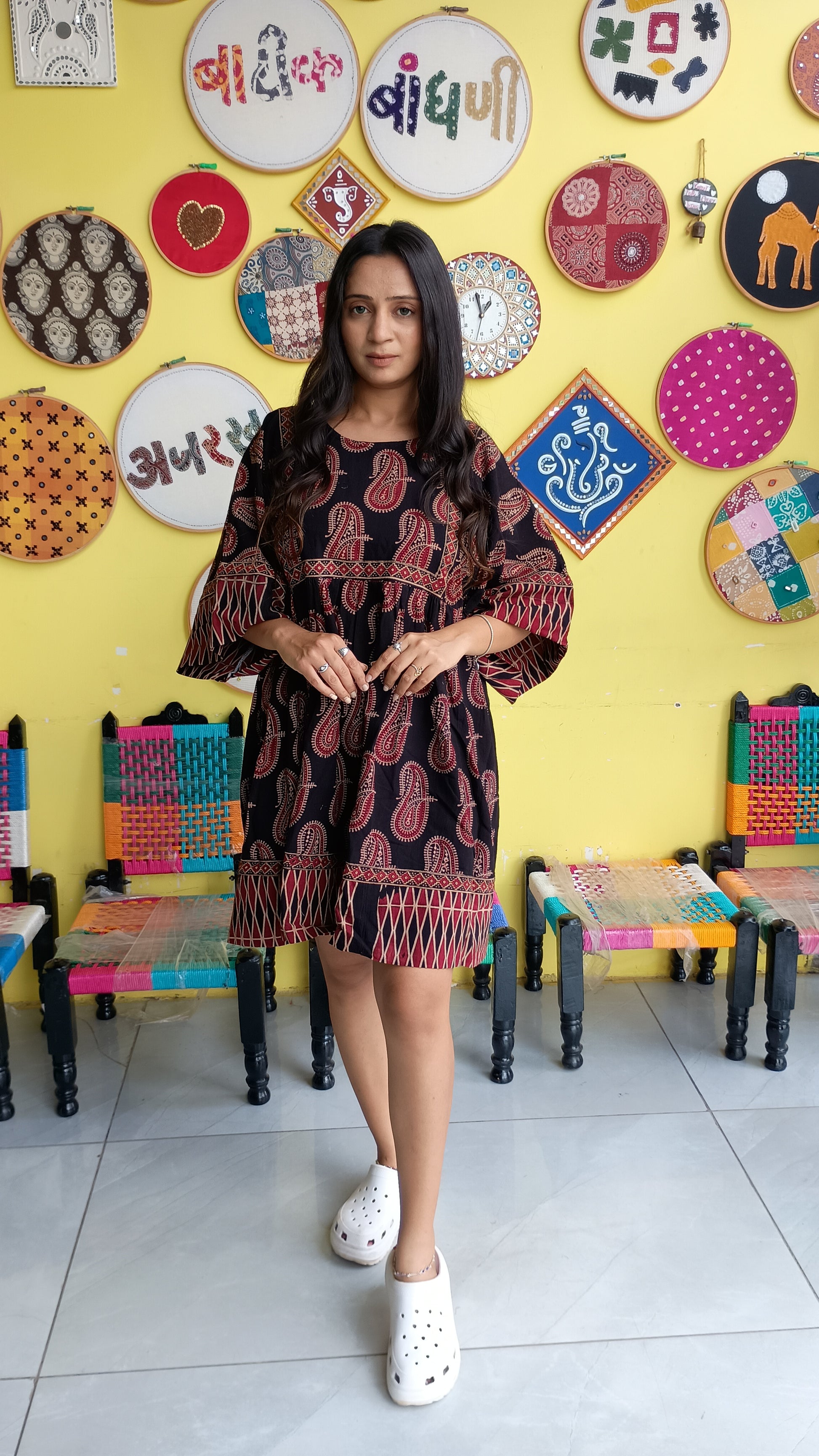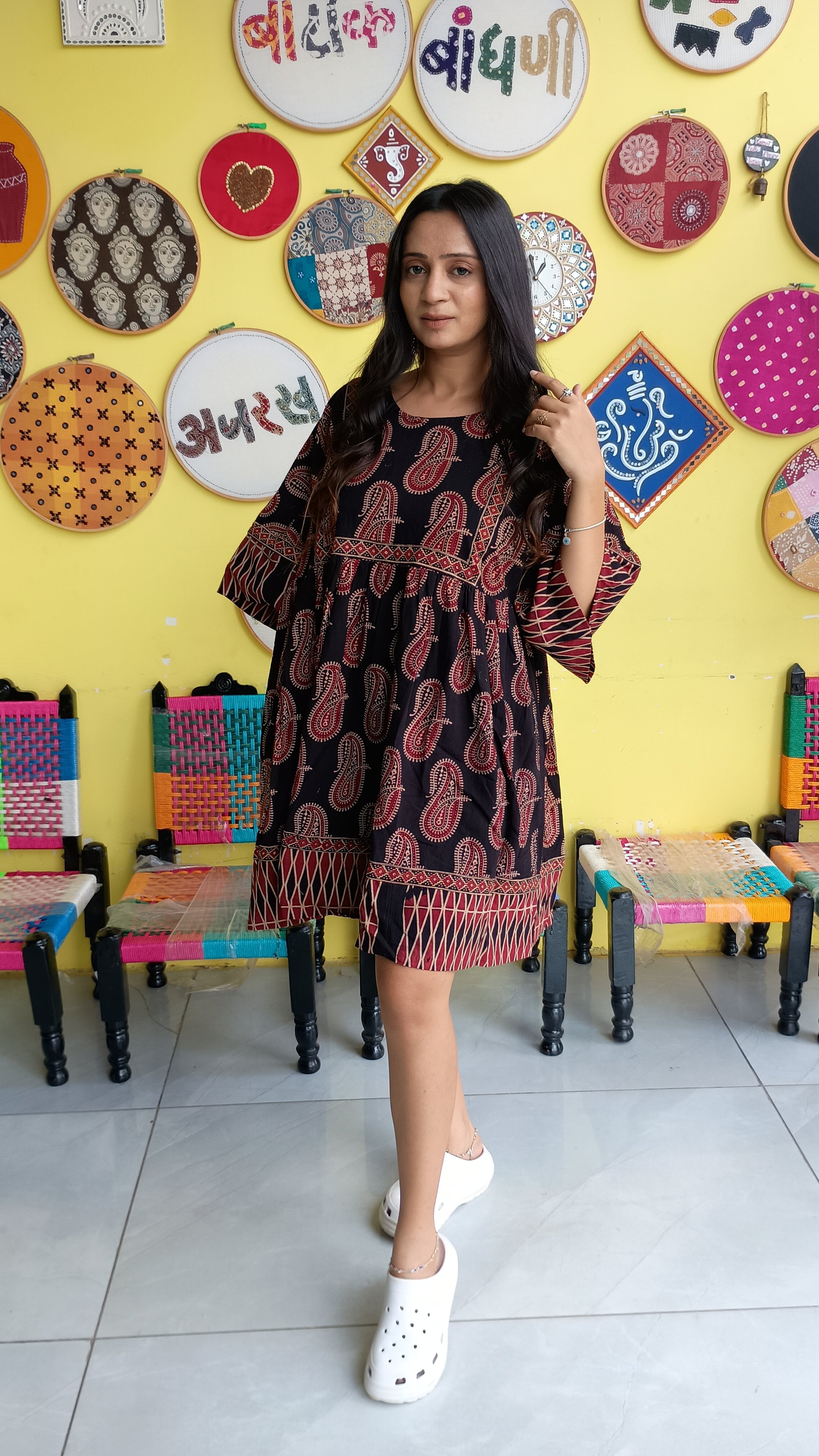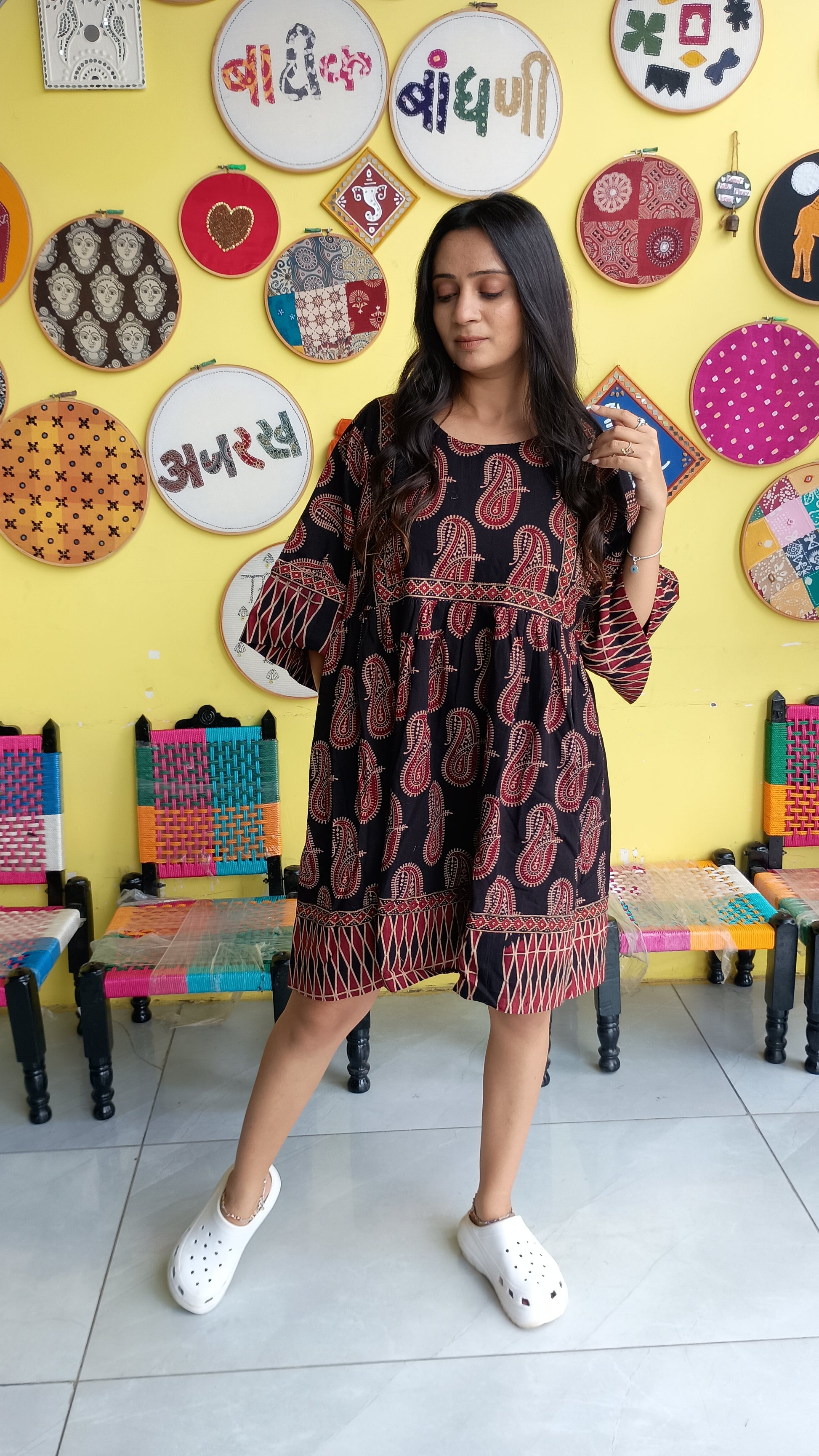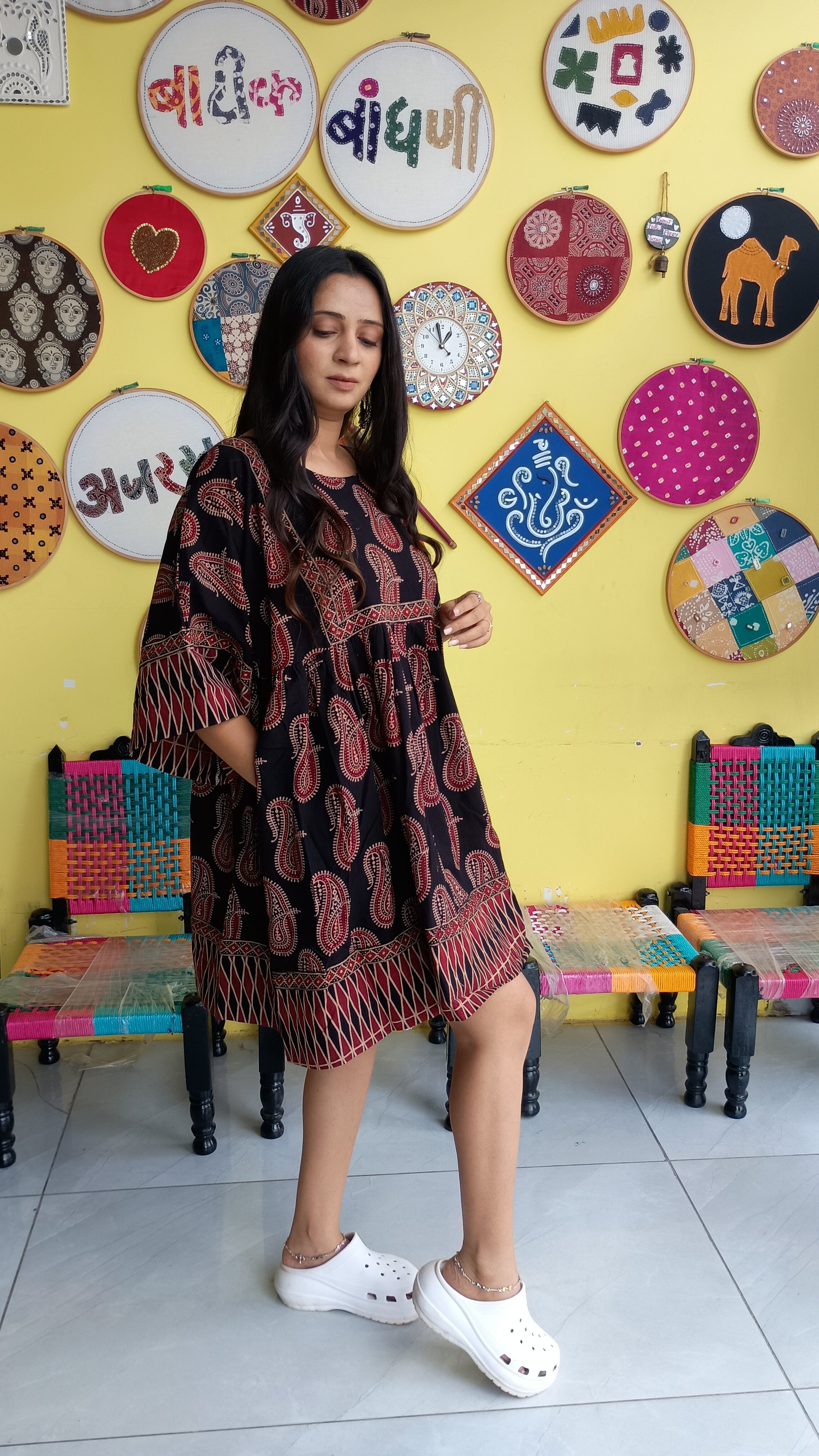 This Ajrakh handblock cotton knee-length one-piece features traditional prints, a comfortable fit, and a stylish one-side pocket. Designed with elegant bell sleeves, it's perfect for casual outings or ethnic-inspired looks, offering both charm and breathable all-day comfort