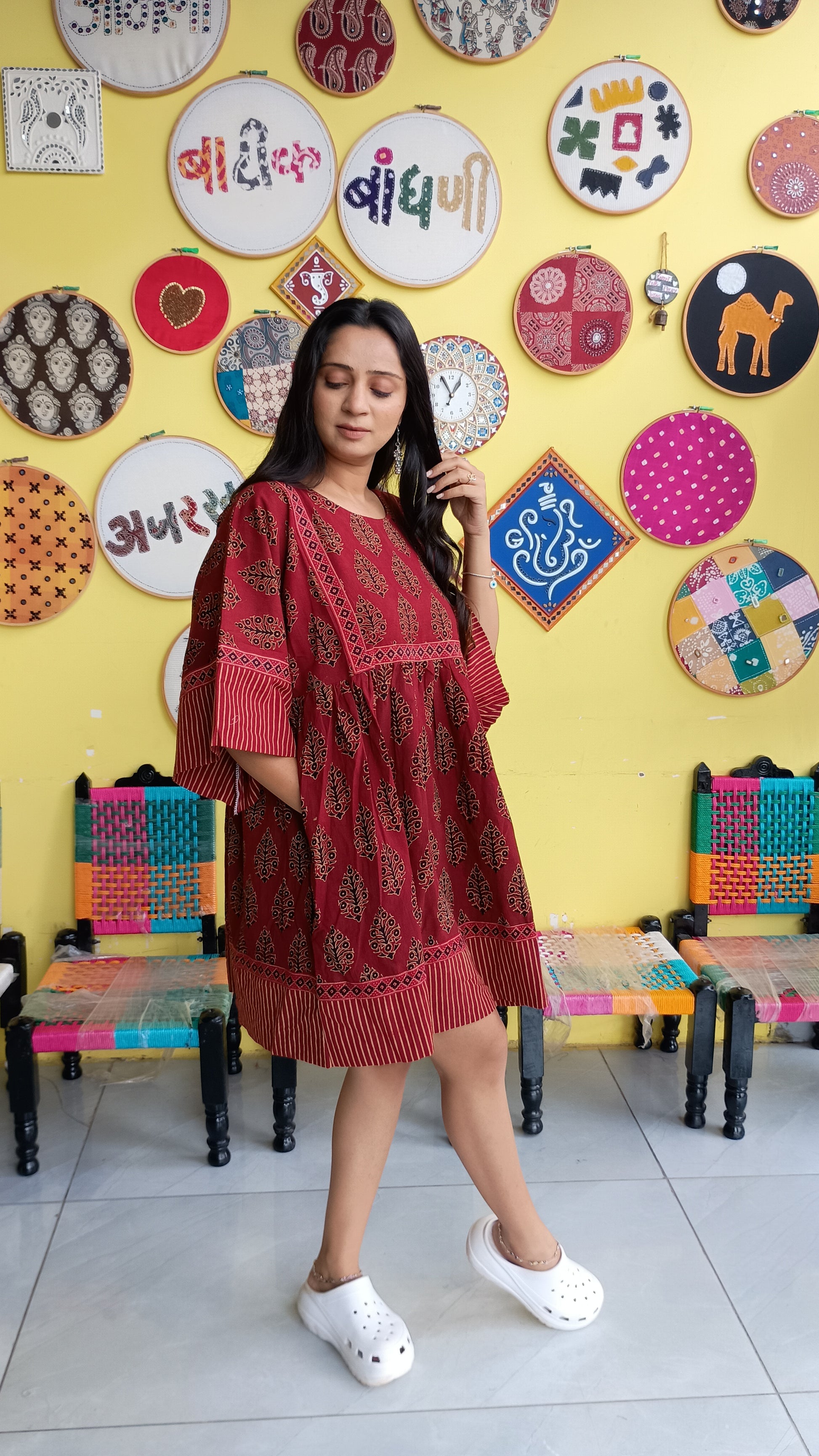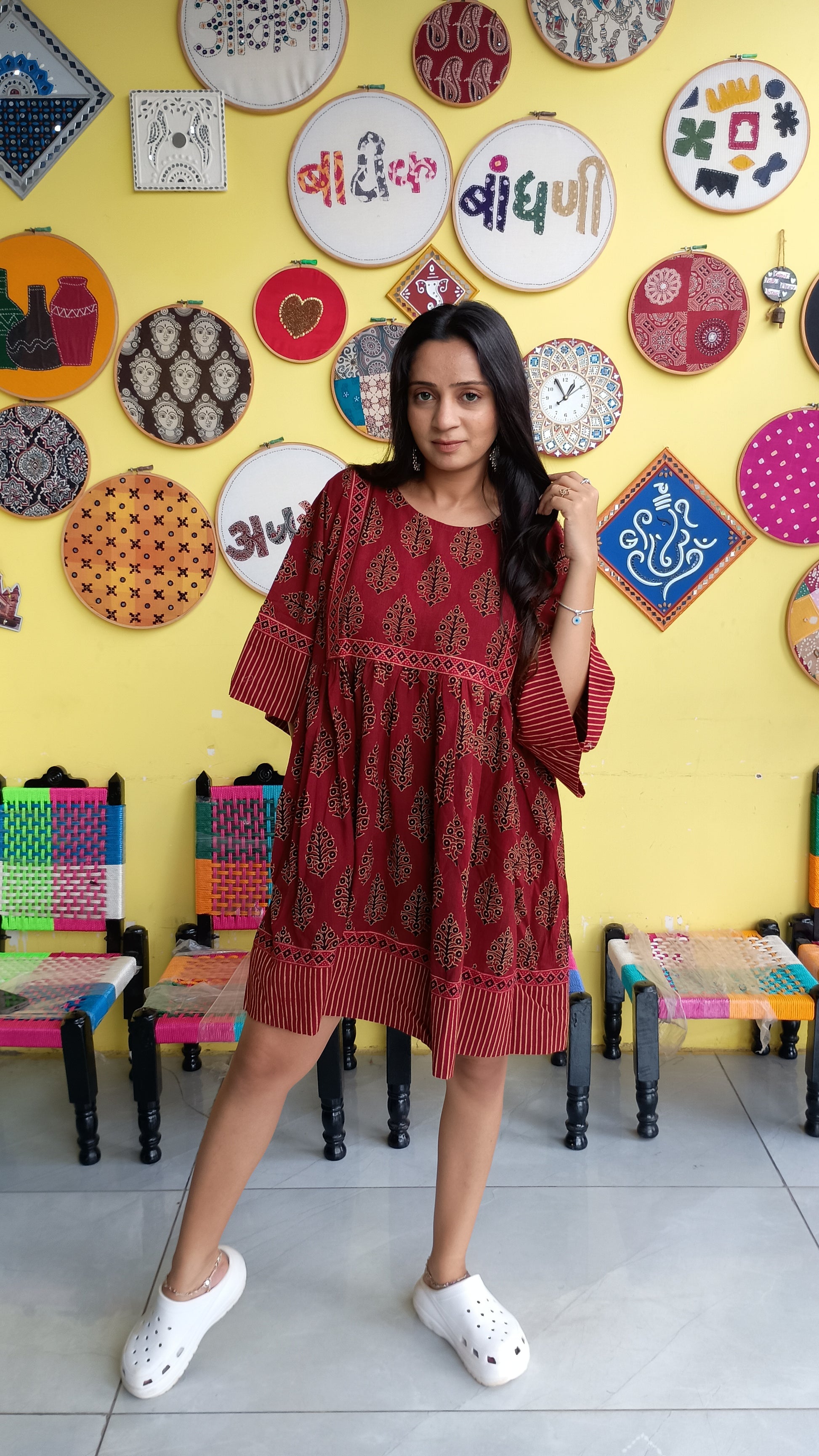 This knee-length Ajrakh handblock cotton one-piece showcases classic prints and a relaxed fit, enhanced by a chic one-side pocket. Featuring graceful bell sleeves and a round neckline adorned with an Ajrakh border, it combines traditional artistry with breathable comfort. Ideal for casual wear or ethnic-inspired ensembles, it measures approximately 36 inches in length, delivering both style and ease throughout the day.