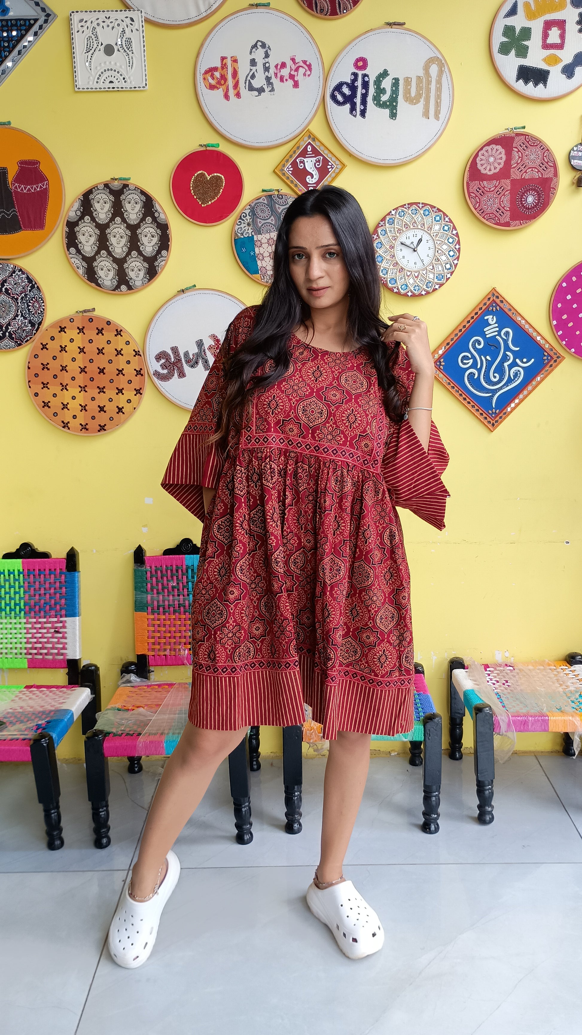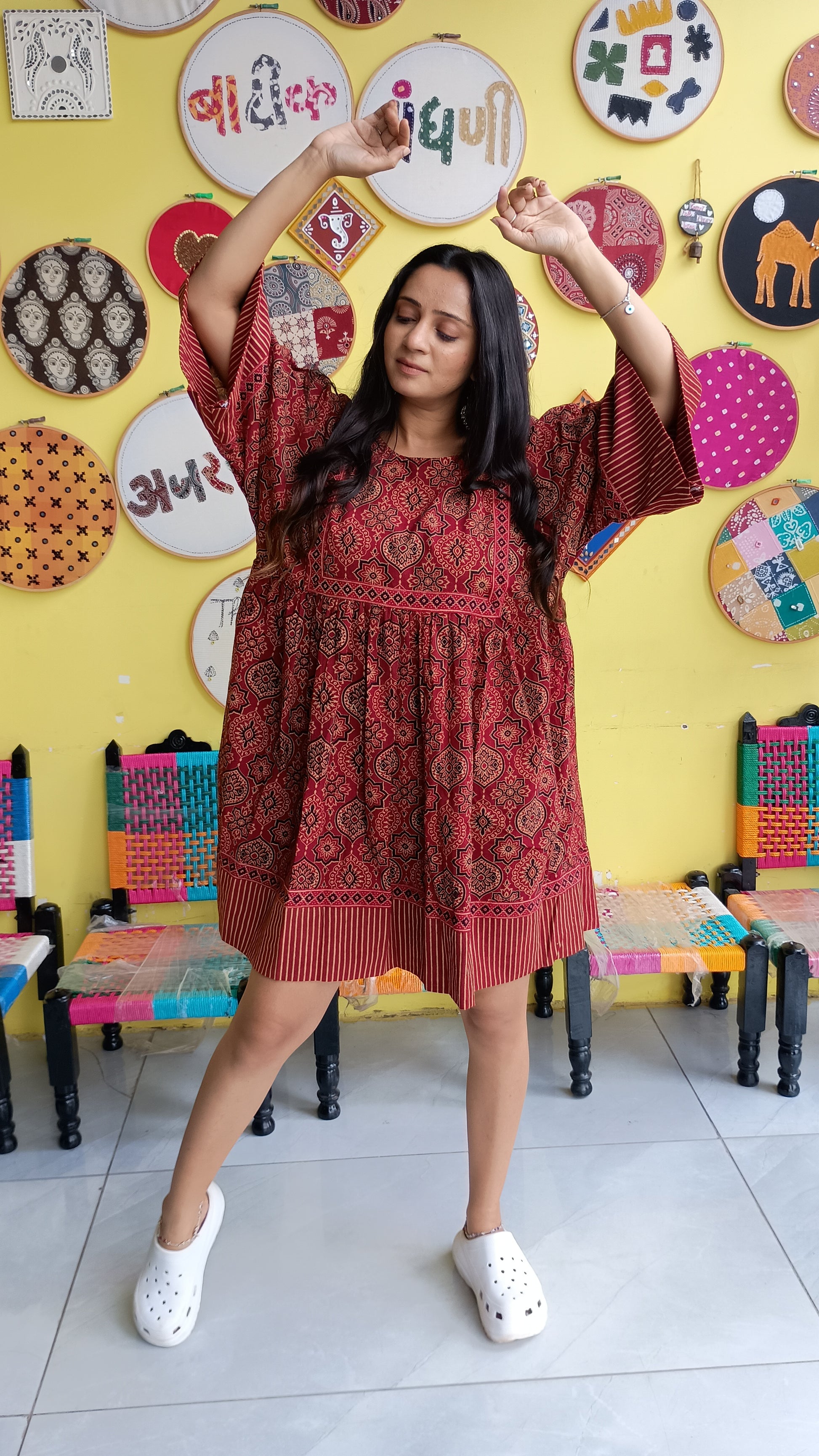 Embrace bold tradition with the "Jessica" Ajrakh handblock cotton one-piece. This 36-inch garment showcases authentic Ajrakh prints and a striking round neckline adorned with intricate borders. Dramatic bell sleeves add flair, while a chic one-side pocket blends style with practicality. Perfect for making a confident statement in casual or ethnic-inspired settings, it offers breathable comfort without compromising on fearless elegance. Stand out with a timeless piece that celebrates heritage and modernity.