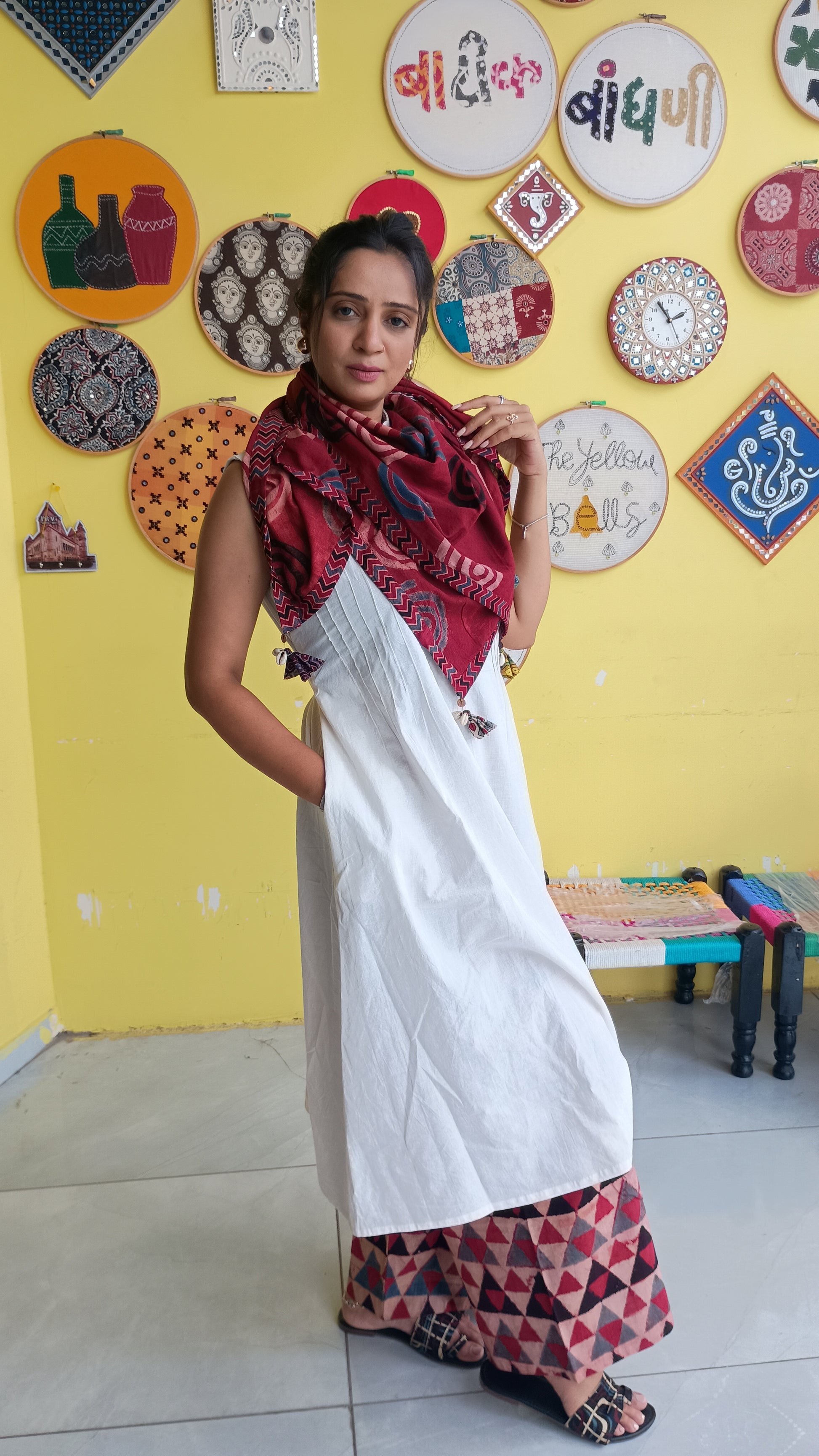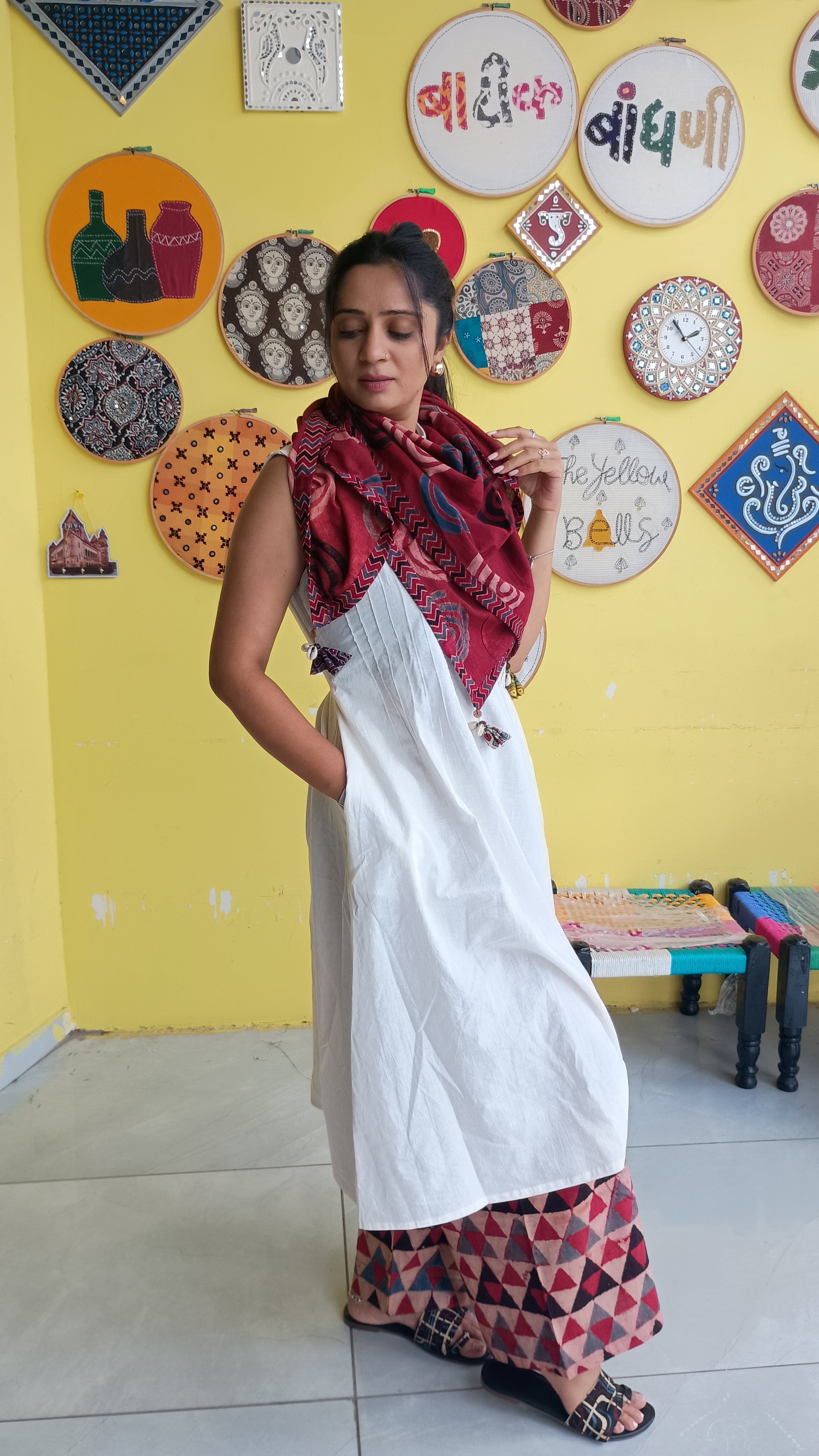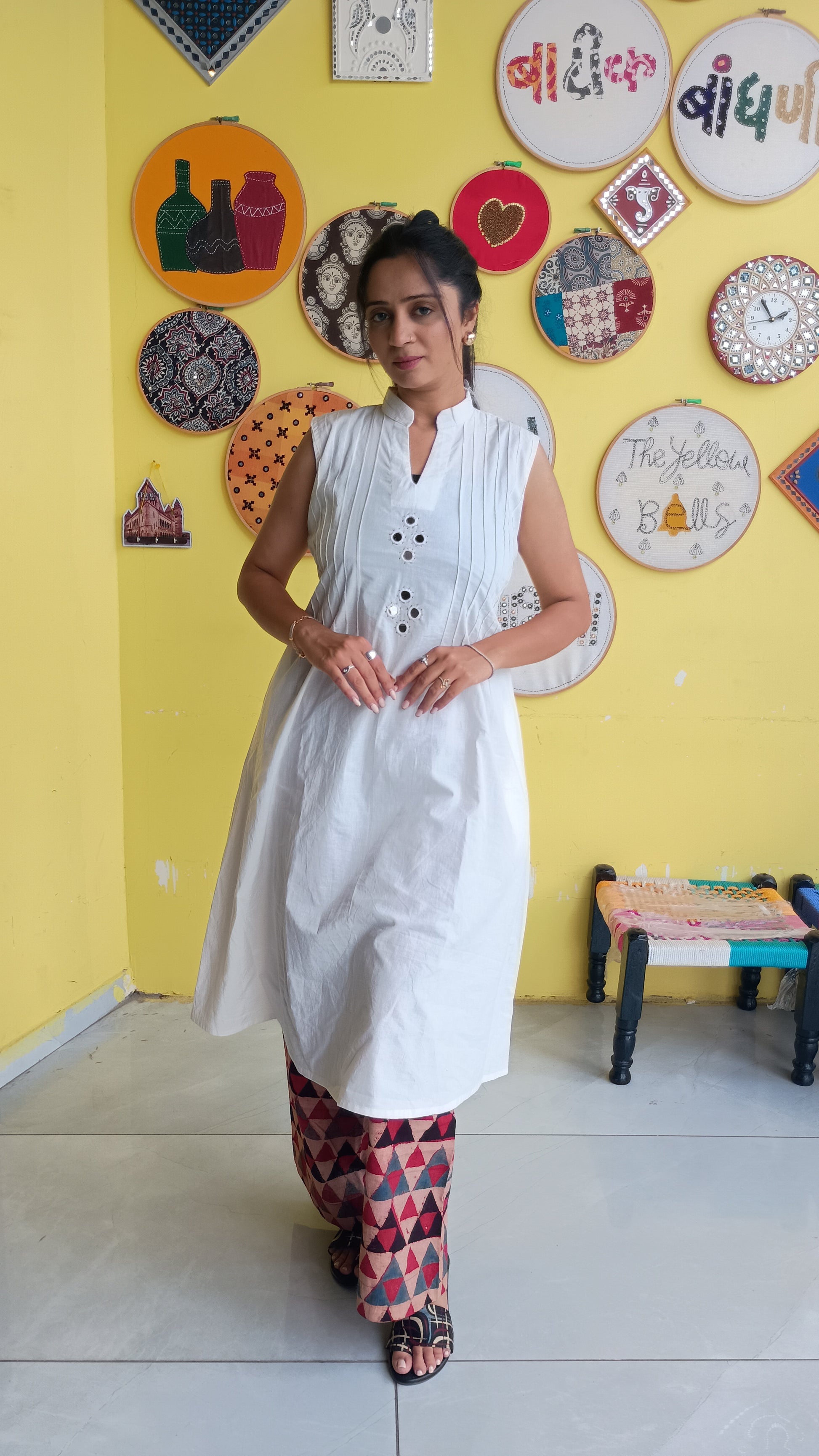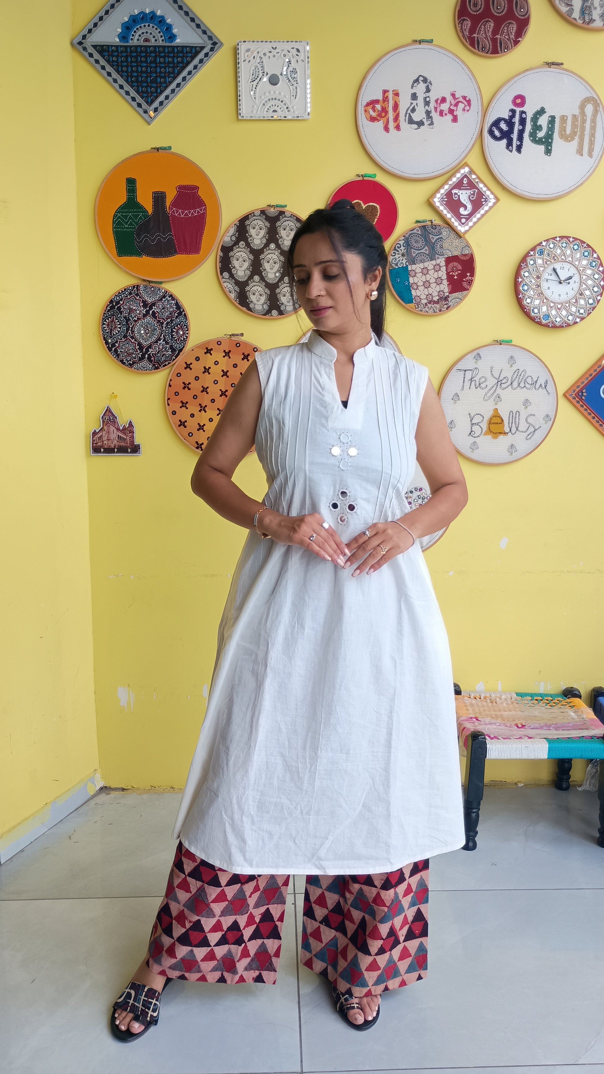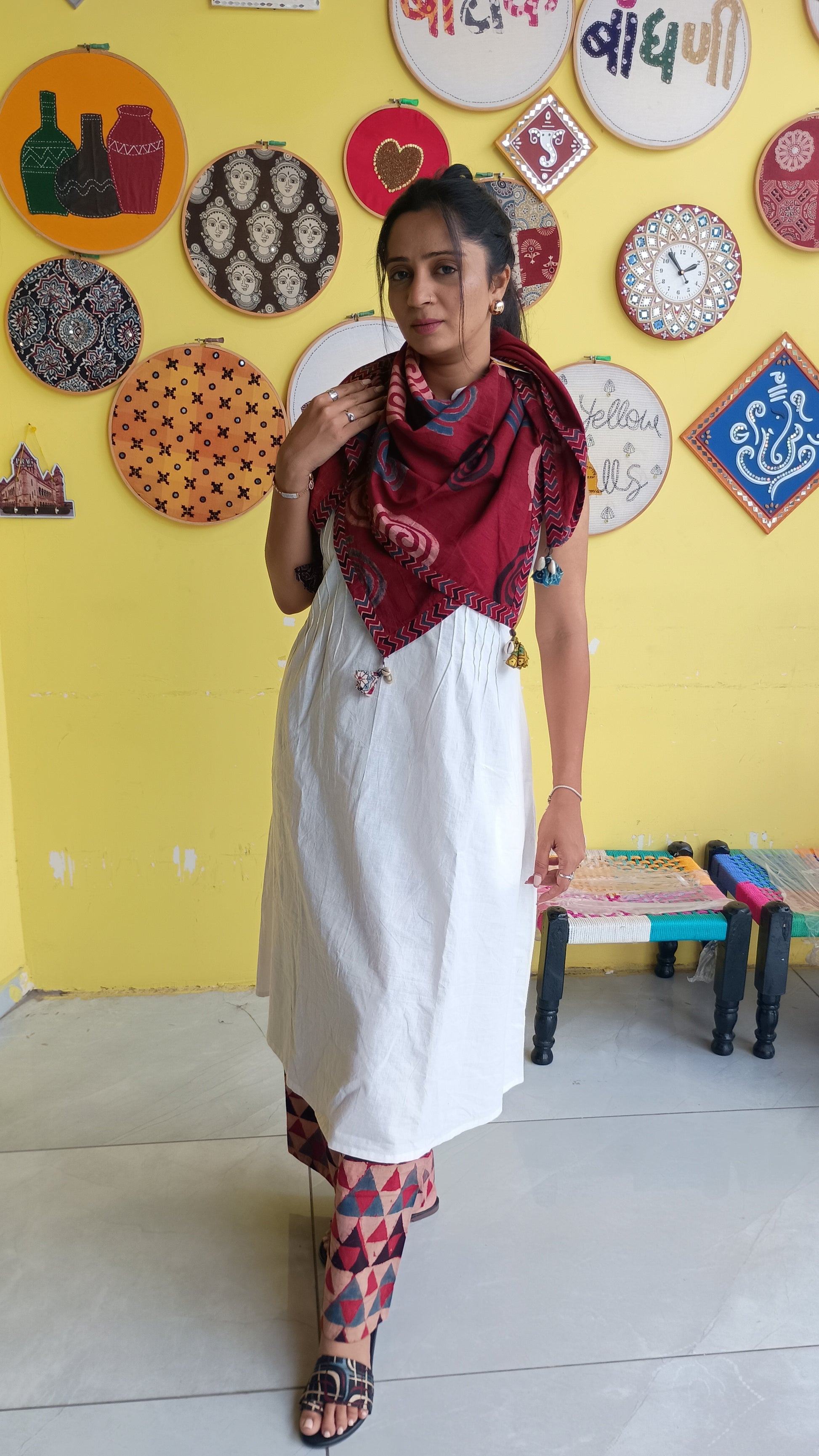 plain A line kurti paired with printed palazzo pants and a scarf creates a stylish and contemporary outfit that balances simplicity with elegance.