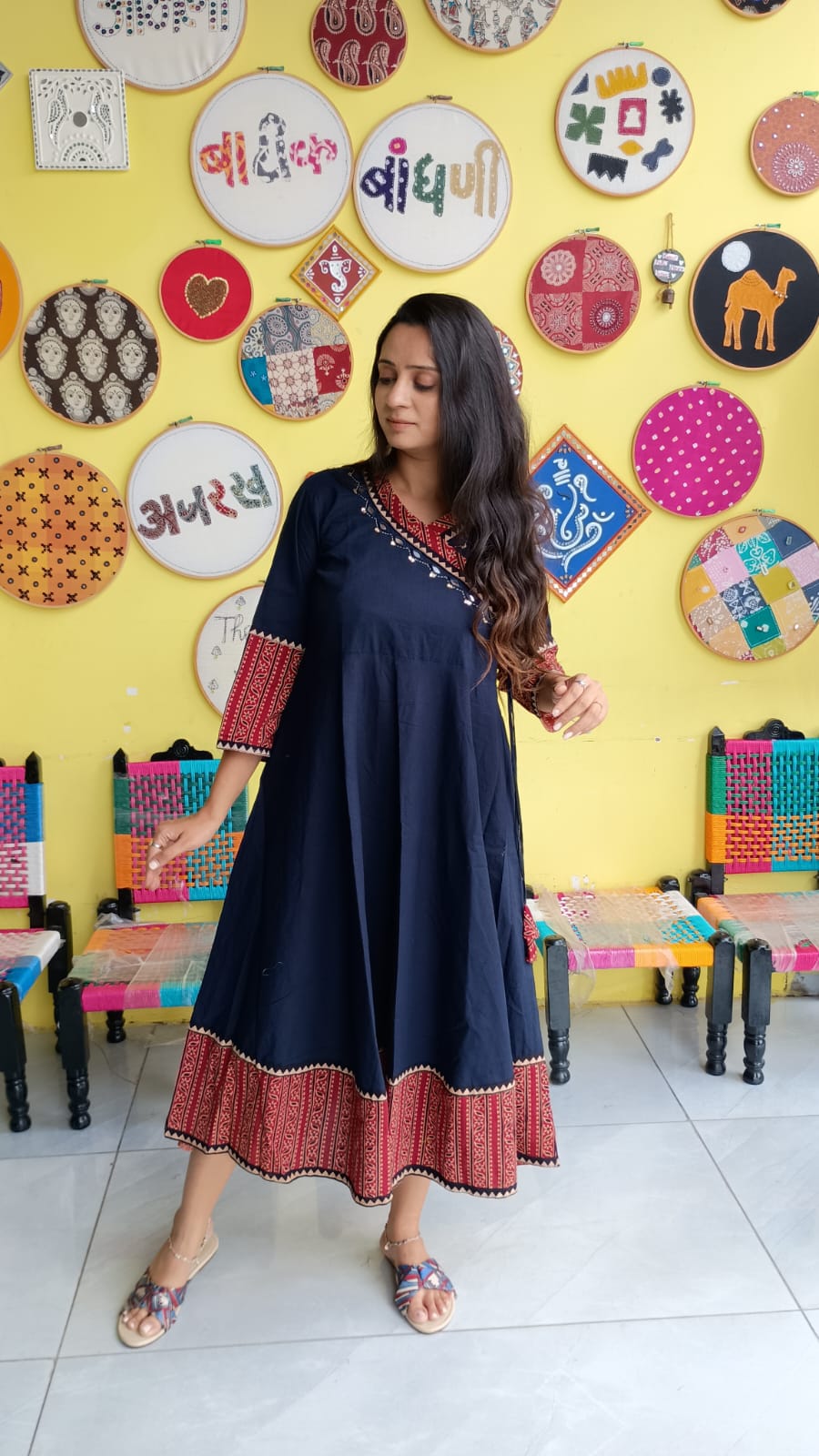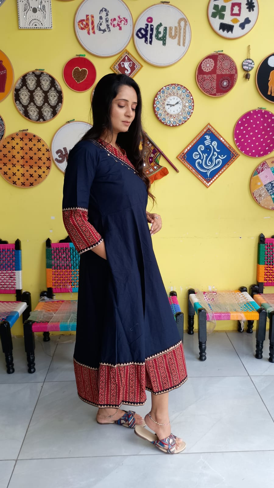 This bold blue kurti, crafted from premium plain cotton, flaunts a striking frock-style A-line silhouette that falls just below the knees. The three-quarter sleeves feature daringly detailed embroidery at the cuffs and neckline, showcasing intricate motifs and borders that command attention. A contrasting patterned fabric, likely floral, accents the hemline, adding an unexpected pop of flair that elevates this statement piece with fearless style.