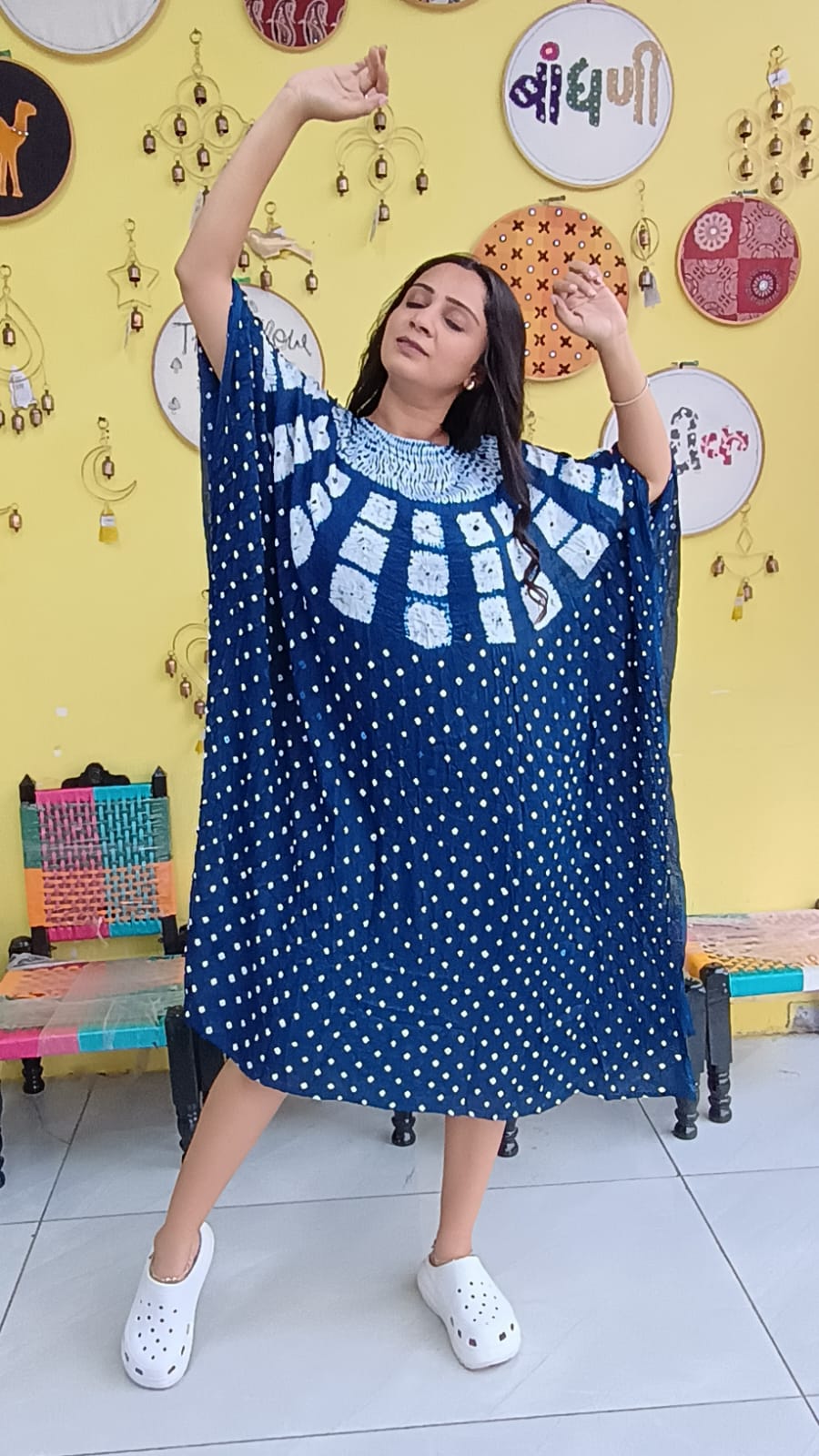 Elevate your ethnic wardrobe with the "Noor" Blue Modal Bandhani Kaftan, featuring a sophisticated shibori print. Crafted from breathable modal fabric, this free-size kaftan ensures a comfortable, flowing fit that drapes elegantly. Its vibrant patterns and relaxed silhouette make it an ideal choice for festive celebrations, casual outings, or stylish resort wear, combining traditional artistry with modern comfort.