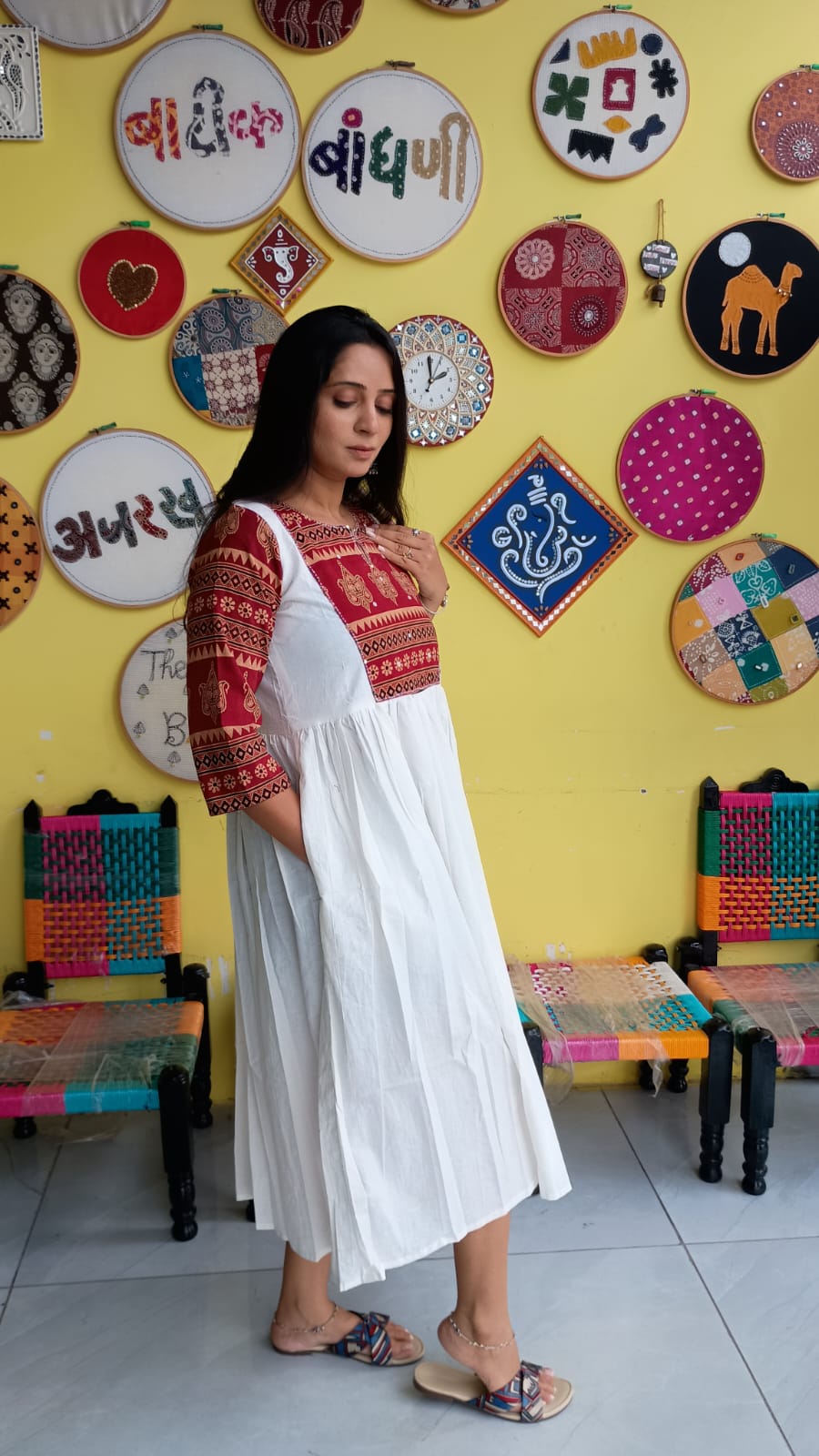 "Pratiti" White Plain cotton natural patch frock style kurti