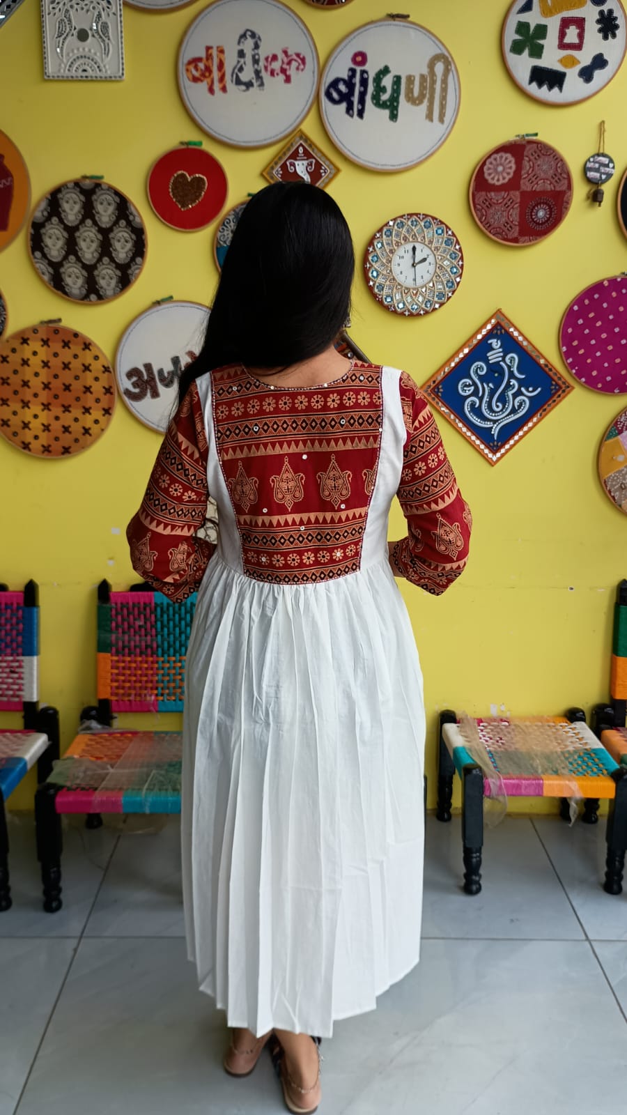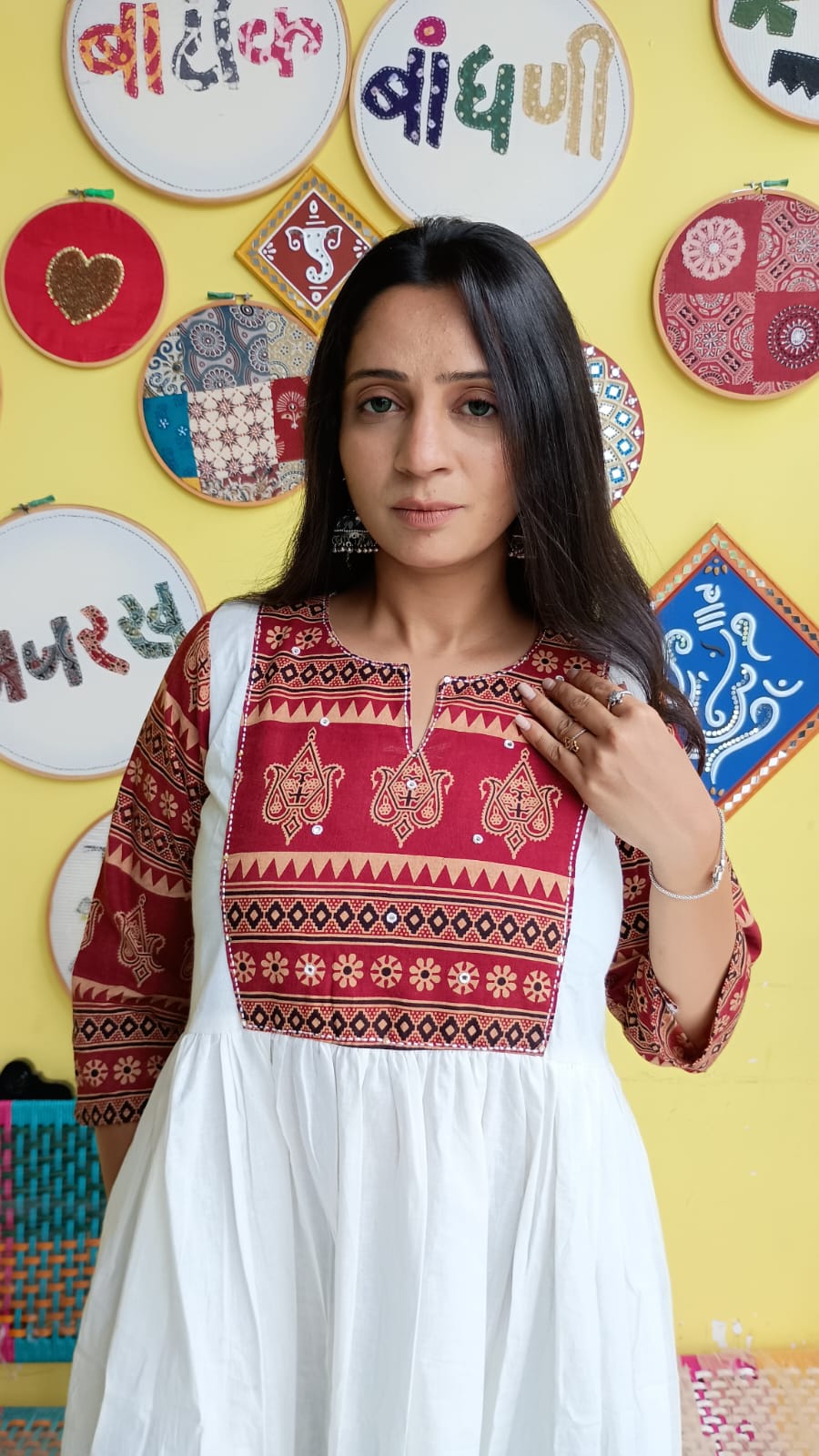 The "Pratiti" White frock-style kurti beautifully blends skilled craftsmanship with timeless tradition. Made from soft, breathable plain cotton, it features natural fabric patches on both the front and back, adding a unique handcrafted touch. The comfortable 3/4th sleeves allow for easy movement, while the delicate katha stitching and subtle mirror work highlight thoughtful hand embroidery. With a handy one-side pocket, this kurti offers both style and practicality, making it a wonderful choice for anyone seeking elegant and versatile ethnic wear for everyday use.